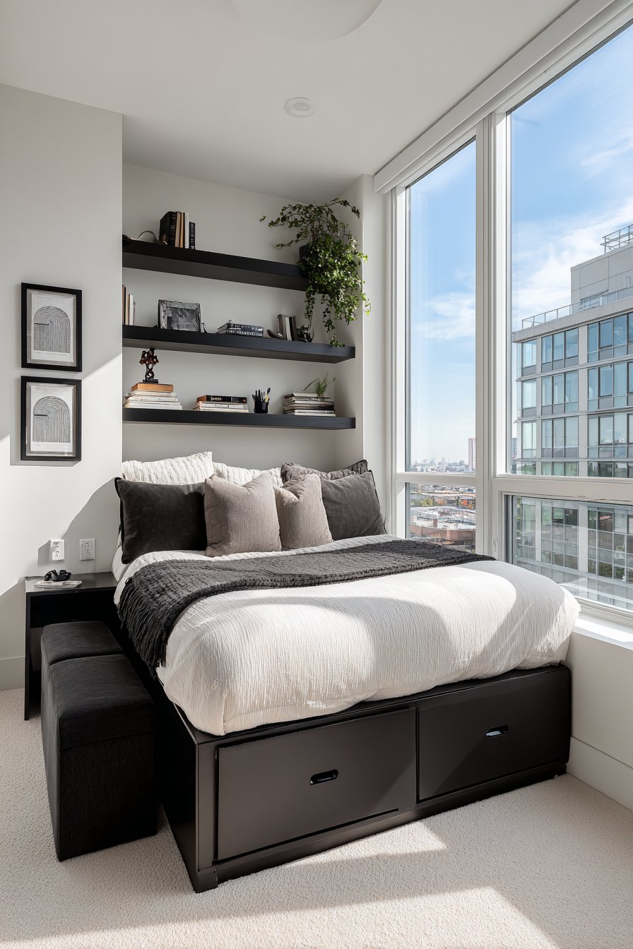 - Choose a storage bed frame with built-in drawers or a hydraulic lift base