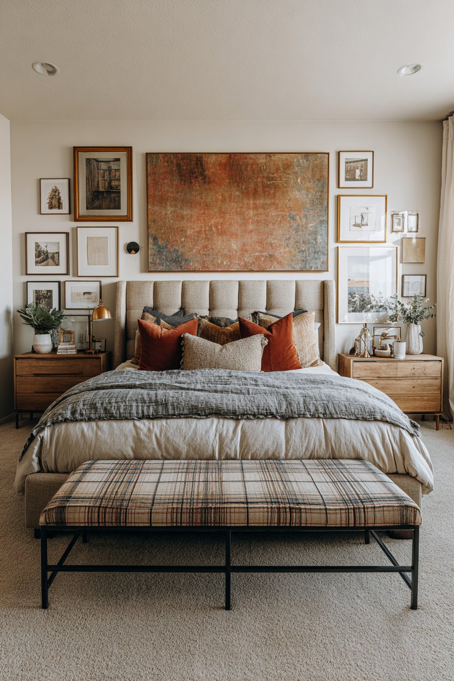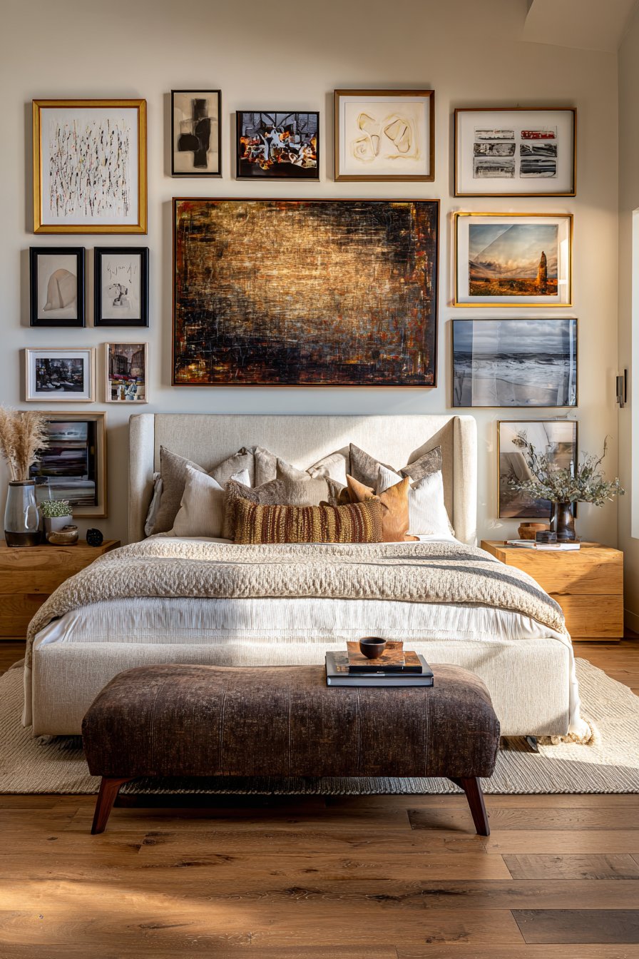 Creating a cohesive gallery wall requires thoughtful curation rather than random accumulation. Choose a unifying element — a color palette, a theme, a frame style, or a specific era of art. This creates visual harmony even when individual pieces are diverse. The wall above the bed is the most impactful location for a gallery arrangement in any bedroom.