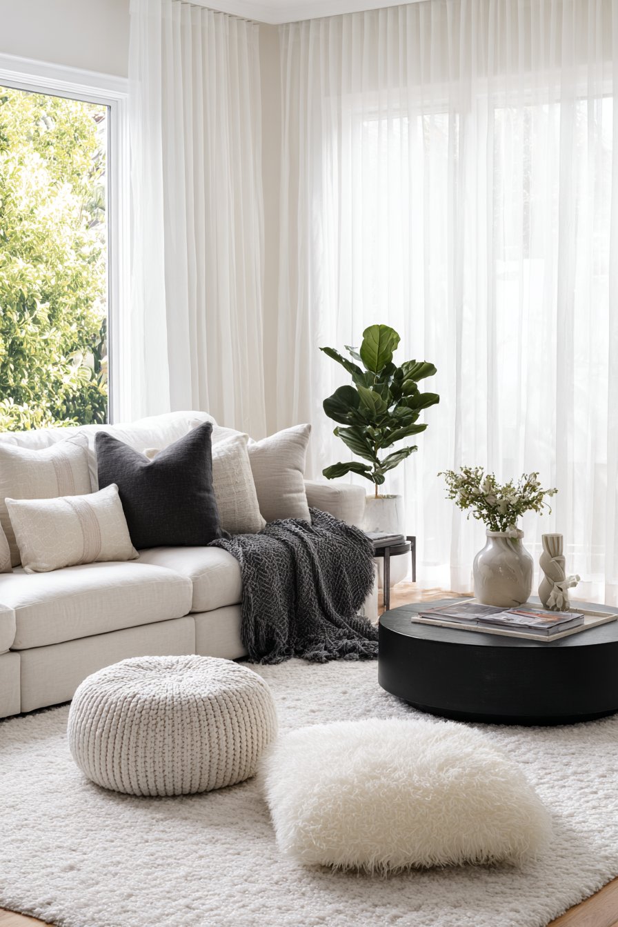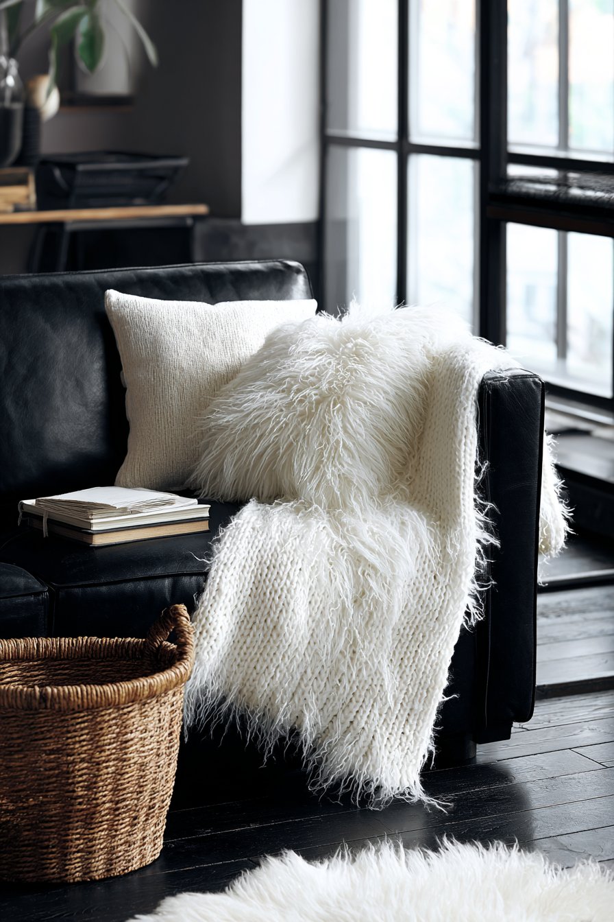 Soft furnishings are your primary defense against a cold, echo-y interior. Hard floors, bare walls, and minimal upholstery are the hallmark of a cold room. The opposite of this — layered, plush soft furnishings — creates the warmth and coziness that black-and-white rooms desperately need.