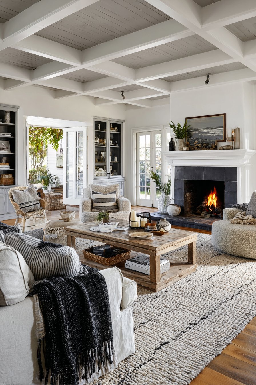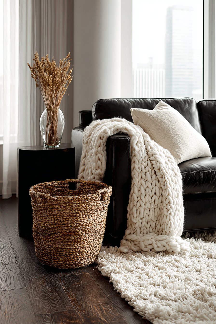 Start building texture from the floor up. A high-pile area rug in ivory or charcoal immediately softens a black-and-white space. Add woven baskets, a bouclé armchair, or a velvet accent piece to continue layering richness throughout the room. Each new texture you introduce reduces the clinical feel and adds depth.