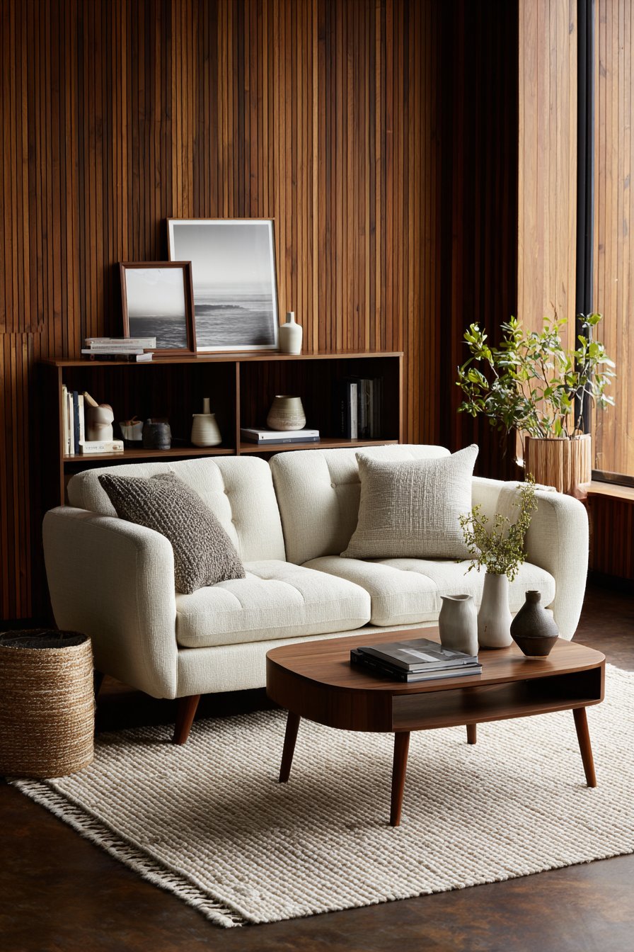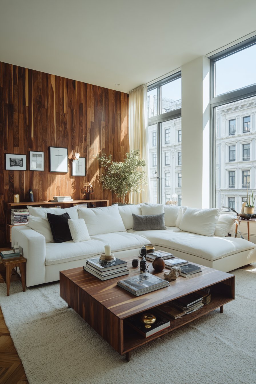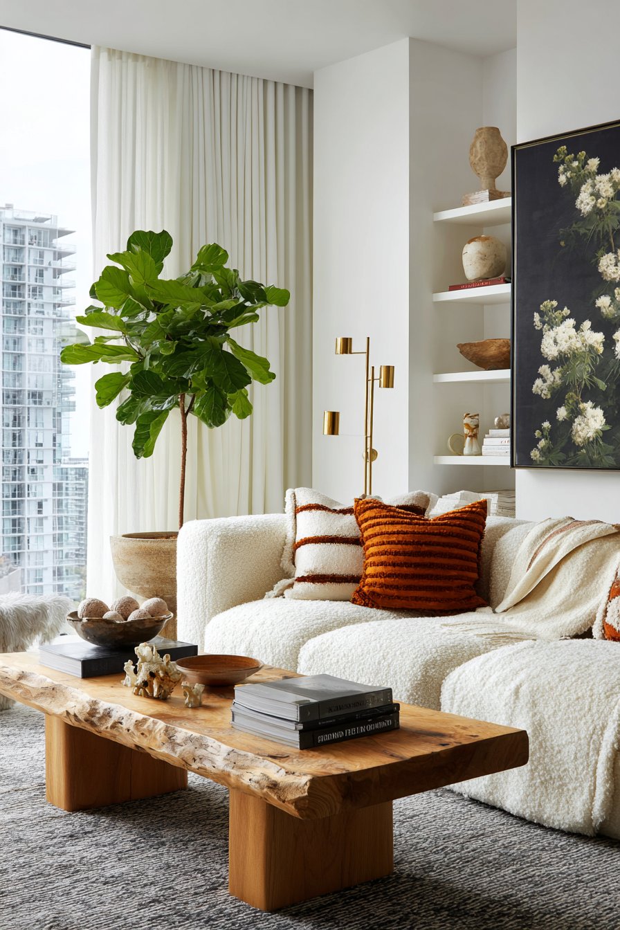 - Introduce a walnut or oak coffee table as a central warming element