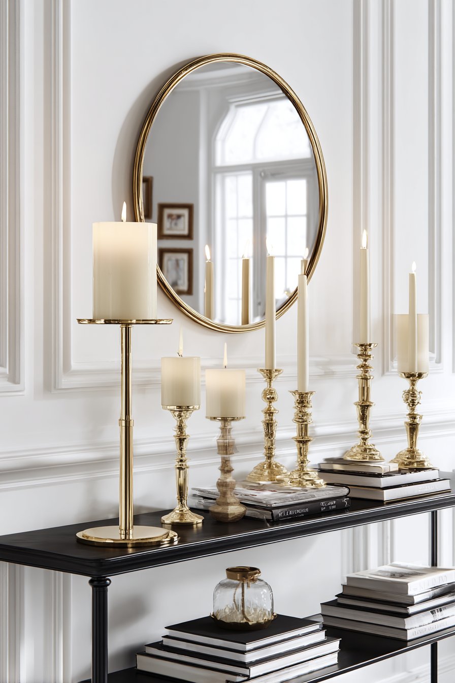- Incorporate bronze or brass candle holders on shelving and tables