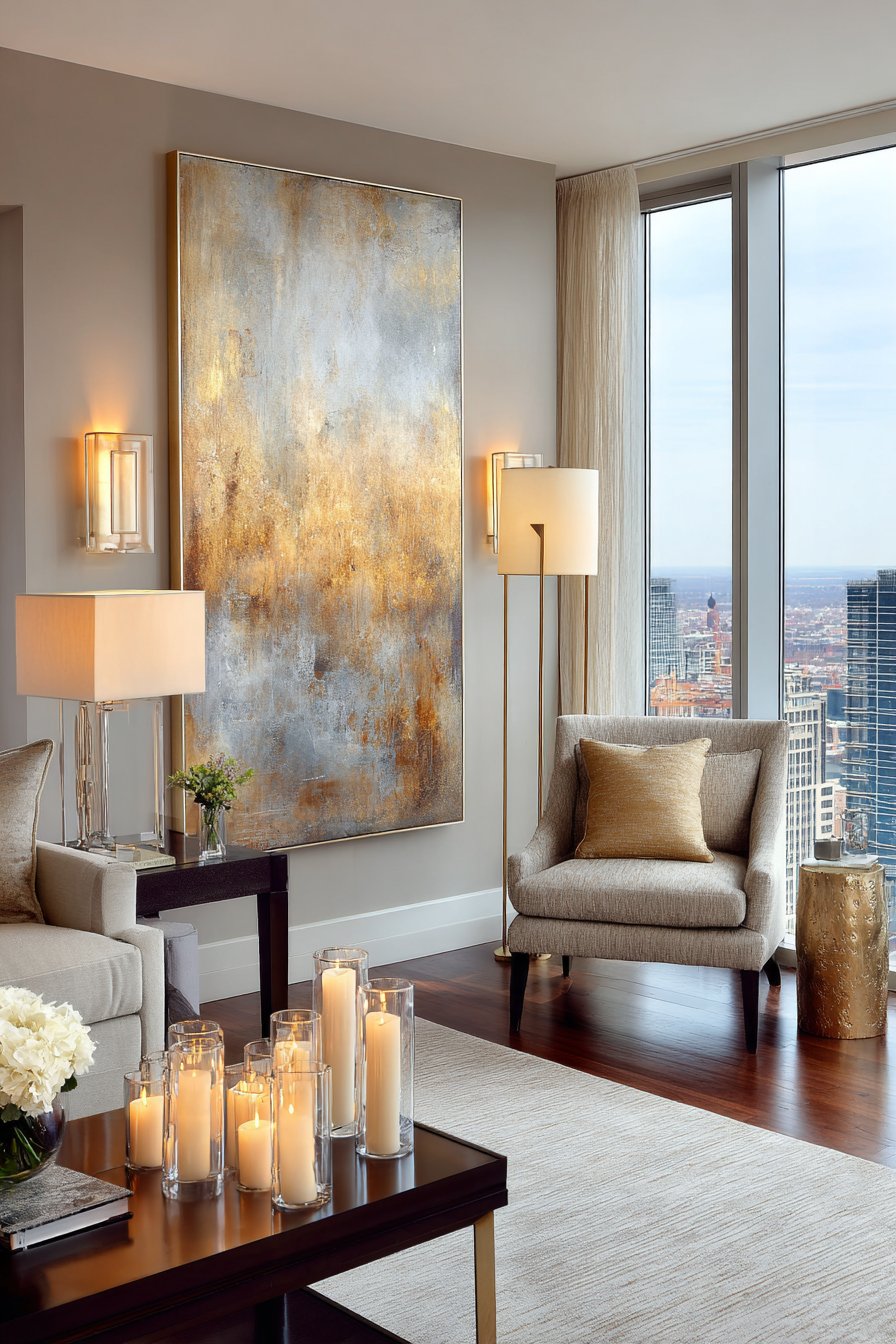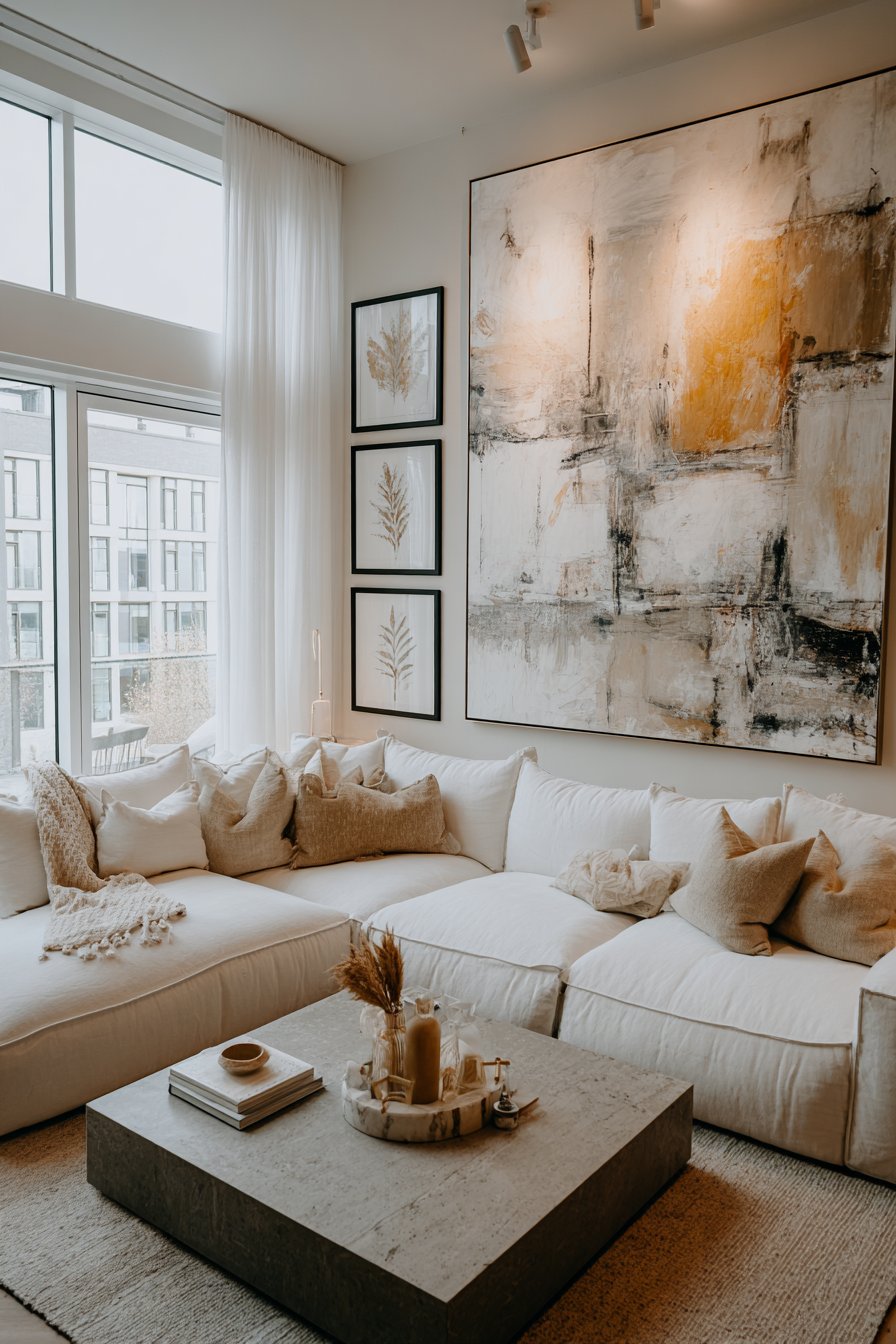 Consider oversized artwork with organic shapes, warm tones, or rich textures. Abstract paintings with gestural brushwork, botanical prints, or photography with warm tonal ranges all work beautifully in this context. The art does not need to match the palette exactly — in fact, art that introduces a hint of warmth will enrich the overall composition.