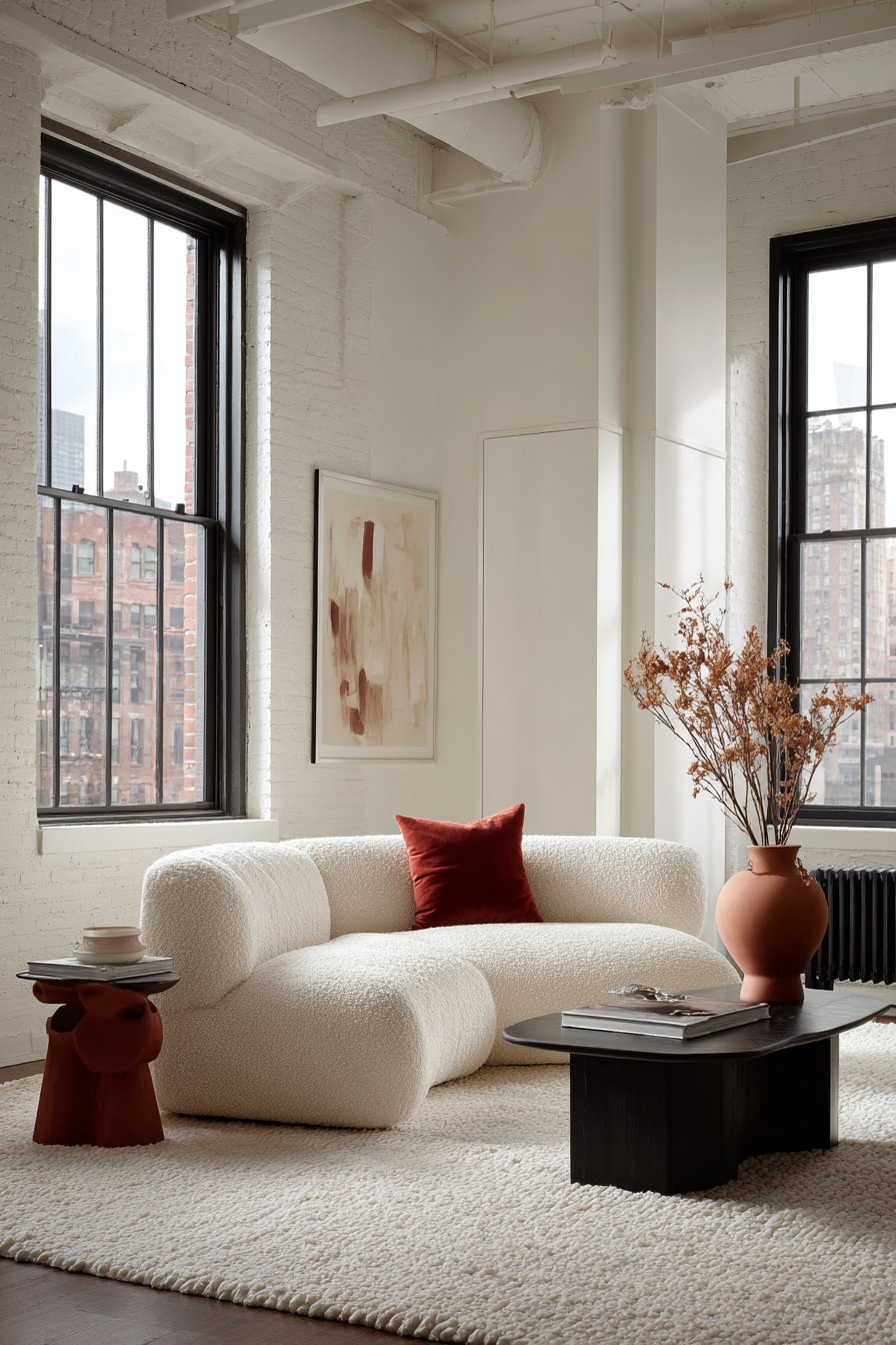 Warm accent colors work best in this context. Consider deep terracotta, dusty blush, warm camel, sage green, or muted navy. These tones add emotional warmth and prevent the space from feeling like a graphic design project. They work particularly well on cushions, artwork, a single chair, or a decorative vase.