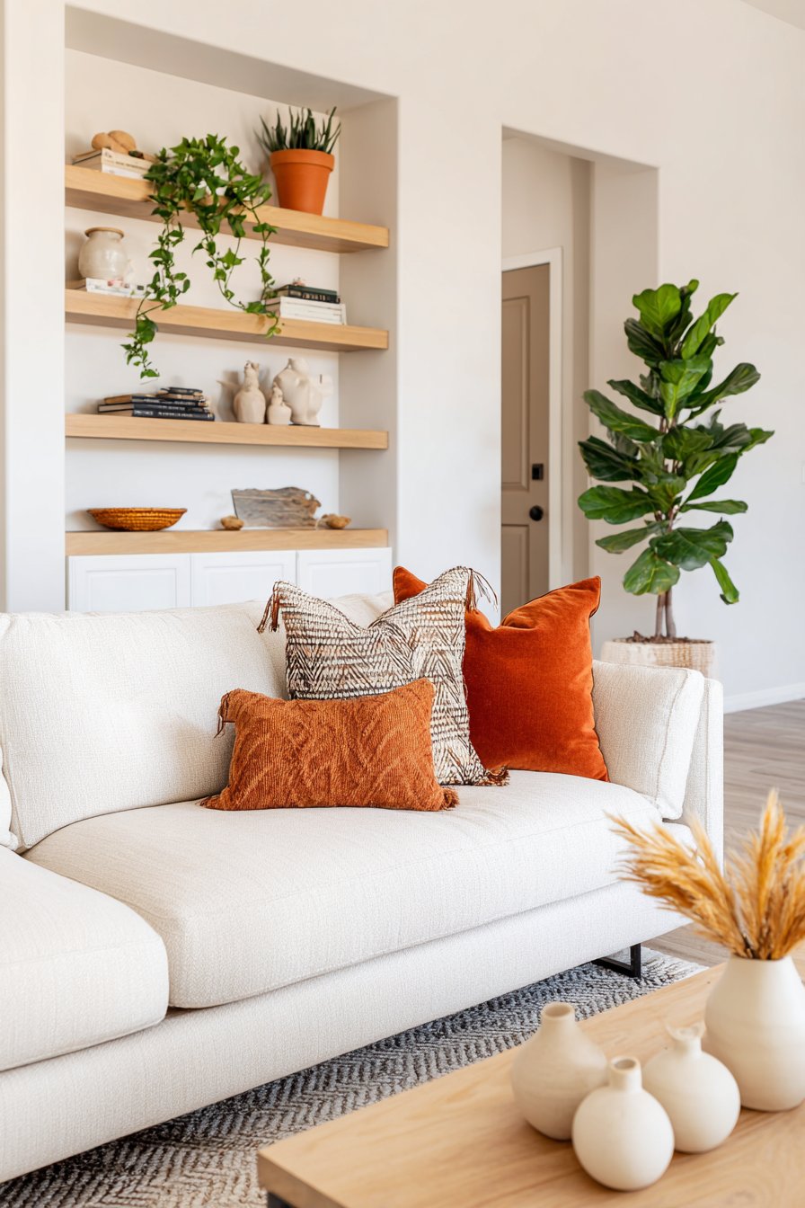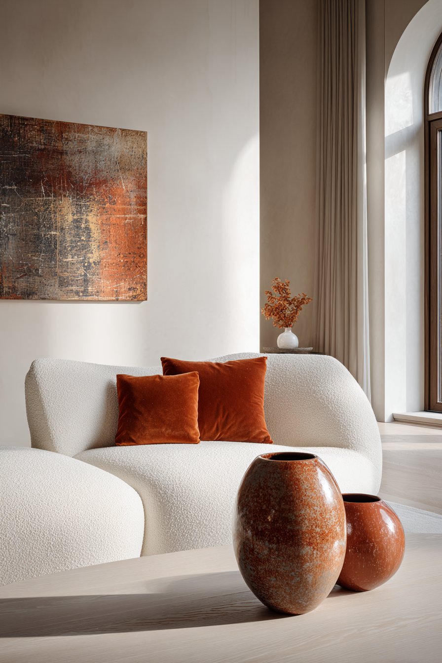 The accent color also creates visual rhythm throughout the room. When you repeat a small amount of the same tone in two or three places — perhaps a terracotta cushion, a terracotta candle, and terracotta tones in one piece of art — the eye moves naturally through the space. This movement creates the feeling of a curated, thoughtful, and welcoming interior.
