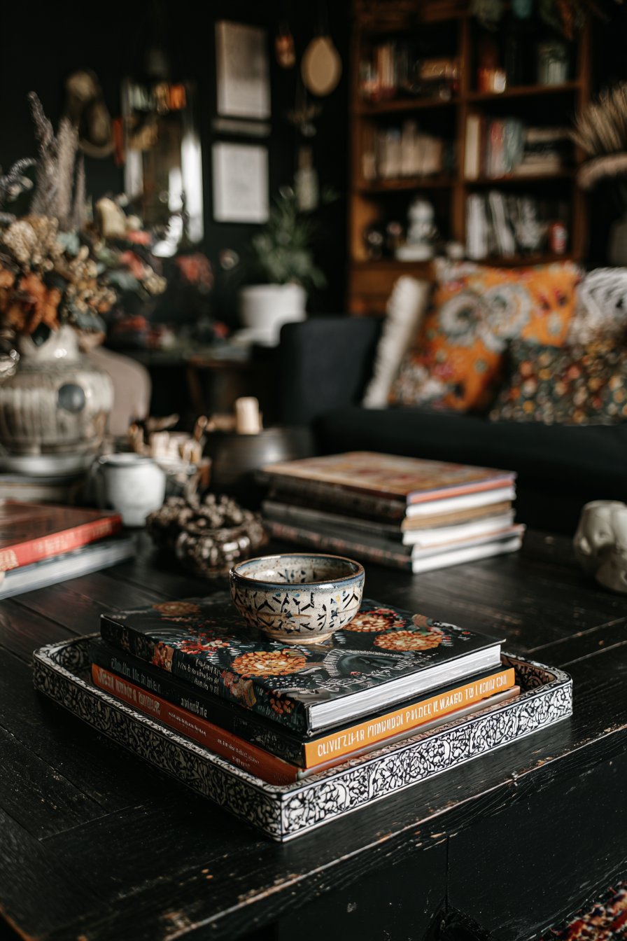 Books and personal objects are among the most powerful warming elements in any interior. They signal that a real person lives in the space, that it has been curated over time, and that it holds meaning beyond mere aesthetics. In a black-and-white room, they add color, texture, and human warmth simultaneously.