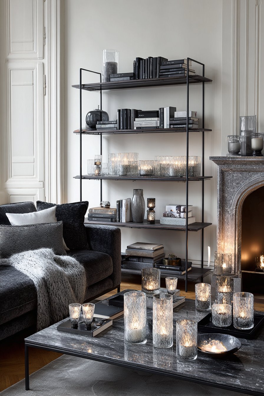 Fireplaces, both real and decorative, provide the ultimate combination of visual and sensory warmth. A fireplace — even an electric or bioethanol model — becomes the instant focal point of a black-and-white room. It introduces warmth at every sensory level simultaneously and anchors the room with a natural gathering point.