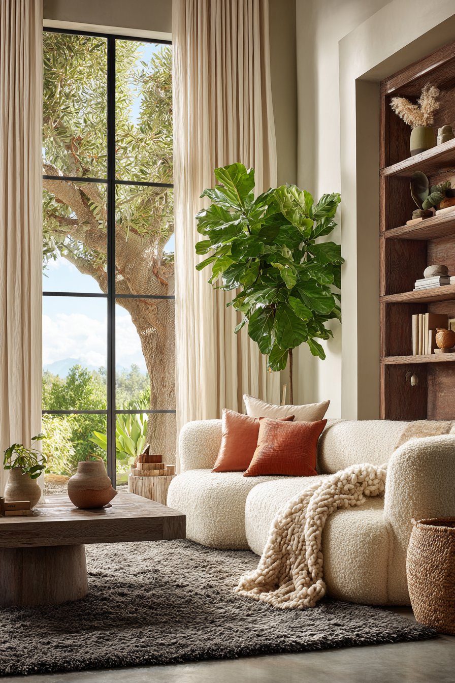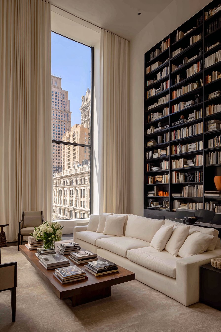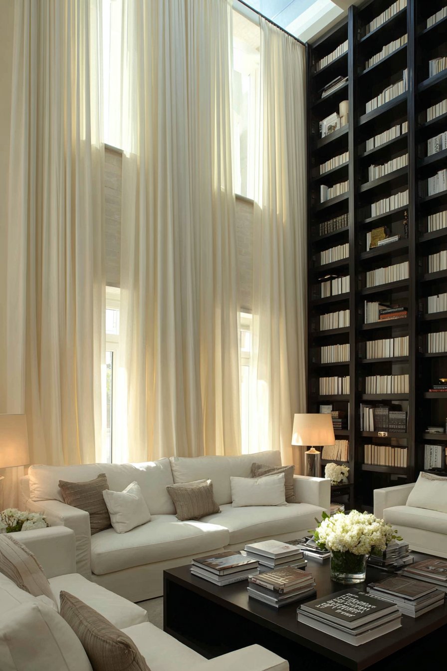 Choose floor-length drapes in soft, tactile fabrics — linen, velvet, or cotton in white, cream, or charcoal. These fabrics pool slightly on the floor and create an immediate sense of luxury and warmth. Hanging curtains higher and wider than the actual window frame also makes windows appear larger and the room more generous.