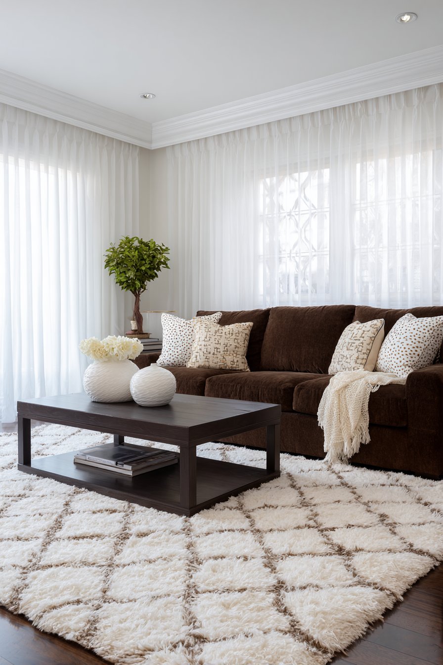 Natural light is the single most transformative element in any living room, but it’s especially critical in a brown space. Heavy, dark drapes absorb light and reinforce the heaviness of brown tones. Replacing them with sheer or lightweight curtains in white, linen, or soft gray immediately opens the room up and allows sunlight to flood in freely.