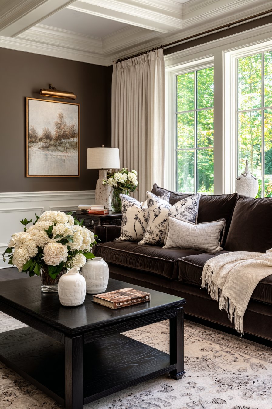 The contrast ratio between dark brown surfaces and white accents is what creates a sense of visual lift. When you place a bright white vase on a dark espresso coffee table, your eye is drawn upward and outward. This prevents the room from feeling like it’s closing in. Even small doses of white — a single white lamp shade, a cream linen throw — can make a measurable difference in how spacious the room feels.