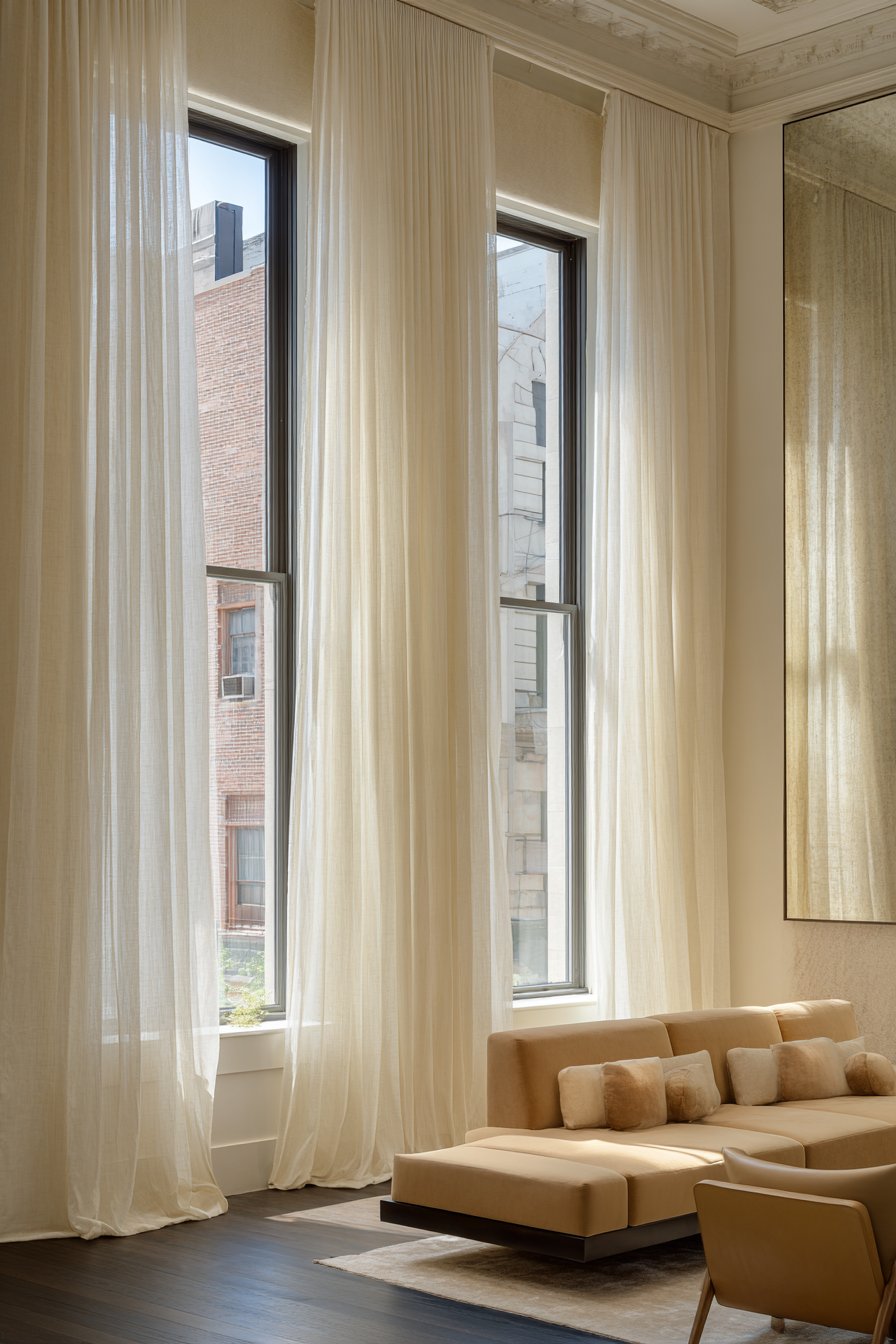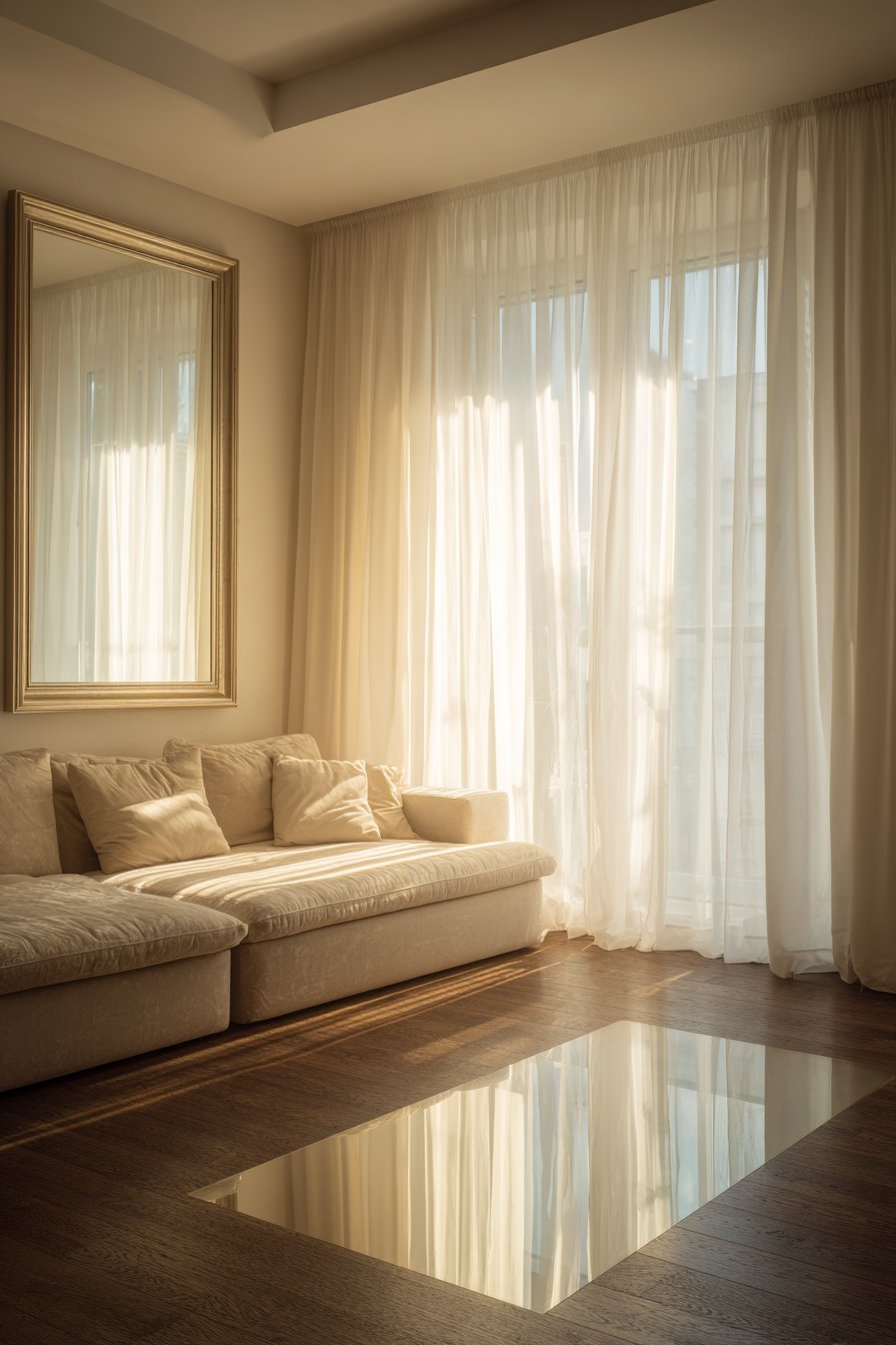 - Choose sheer white or linen panels that filter rather than block sunlight