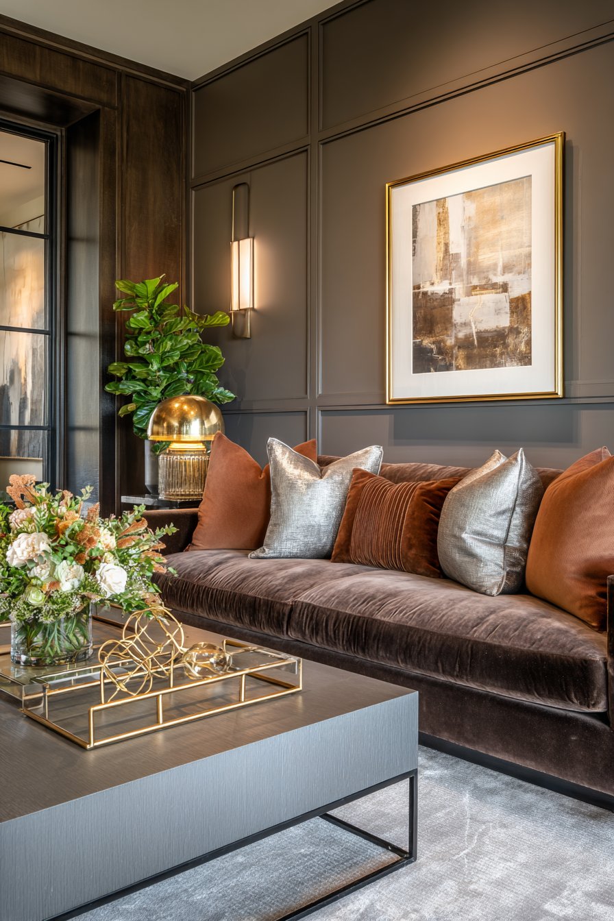 The reflective quality of metals does double duty in a brown space. First, they catch and redirect both natural and artificial light. Second, they provide a visual contrast that feels inherently modern — the combination of matte brown warmth with metallic sheen is a hallmark of high-end interior design. You’ll see this pairing repeatedly in luxury hotel lobbies and magazine-worthy living rooms.