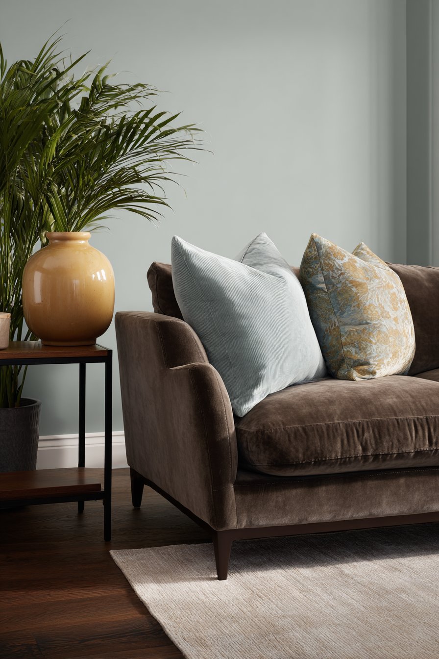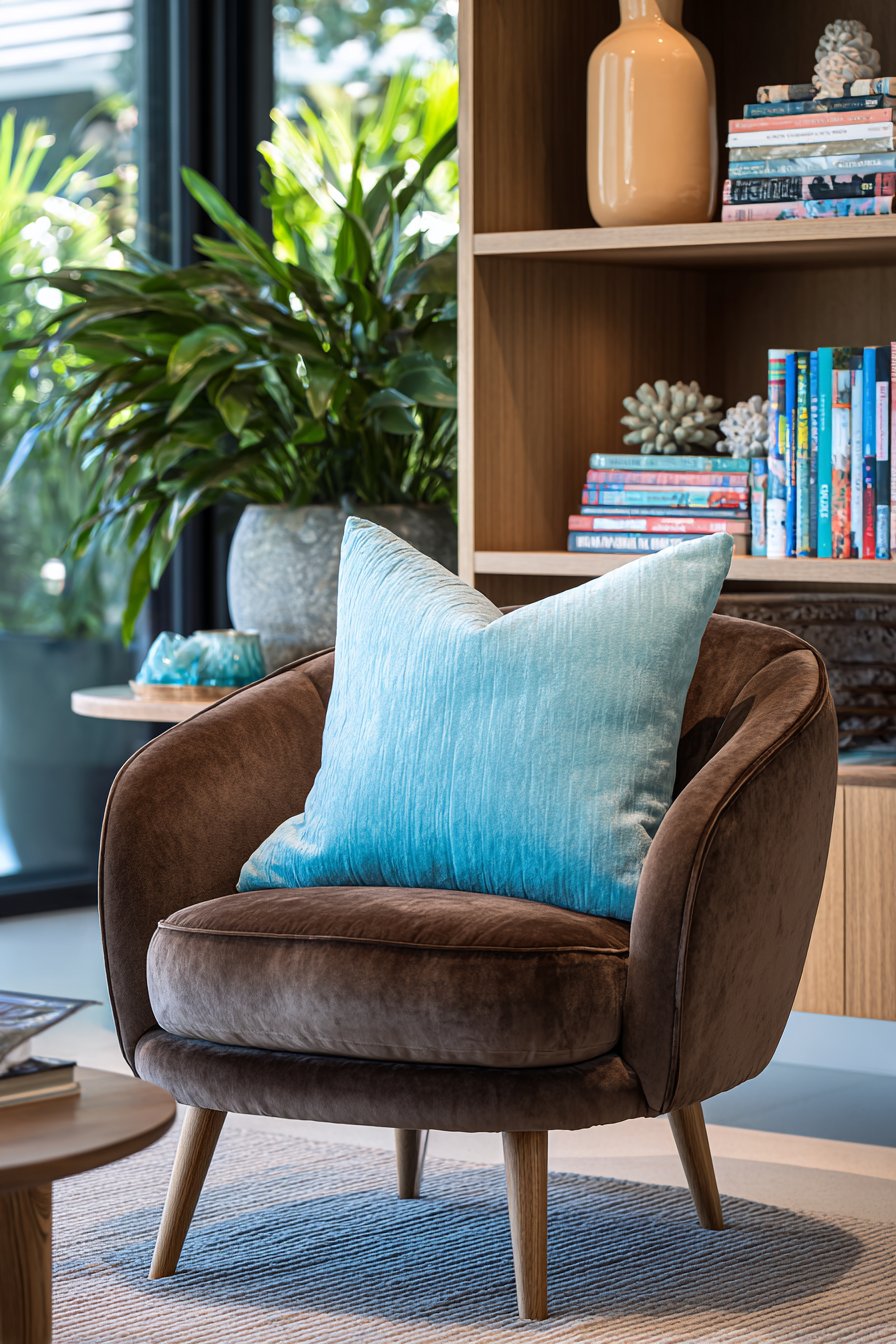 Sage green is particularly powerful alongside brown. It evokes the natural relationship between wood and foliage, which feels inherently fresh and modern. Dusty or powder blue creates a cooler contrast that brightens the space beautifully. Either color introduced through cushions, an accent chair, or even a painted feature wall can lift an entire room’s energy without overwhelming the brown foundation.