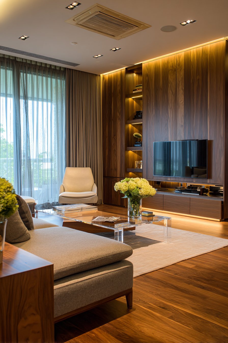 A sofa with tapered wooden legs appears to float slightly above the floor, allowing the eye to travel beneath it and creating a sense of spaciousness. Contrast this with a skirted sofa that sits flush to the ground — that style visually blocks floor space and adds weight. The same principle applies to coffee tables, side tables, and TV consoles. Glass or acrylic tops on tables are particularly effective in brown rooms because they take up almost zero visual space.