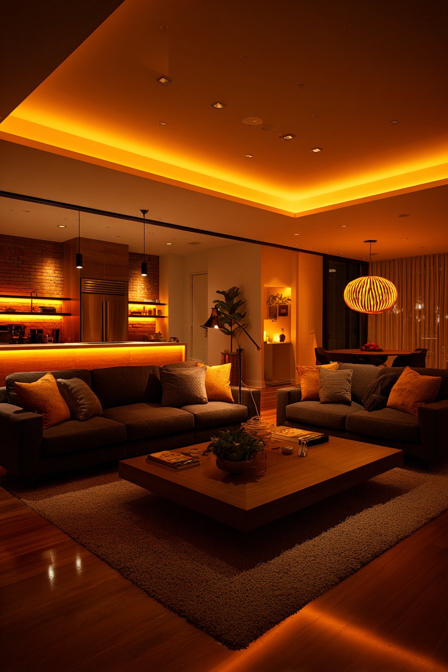 - Use LED strip lighting behind shelving units or under furniture for accent glow