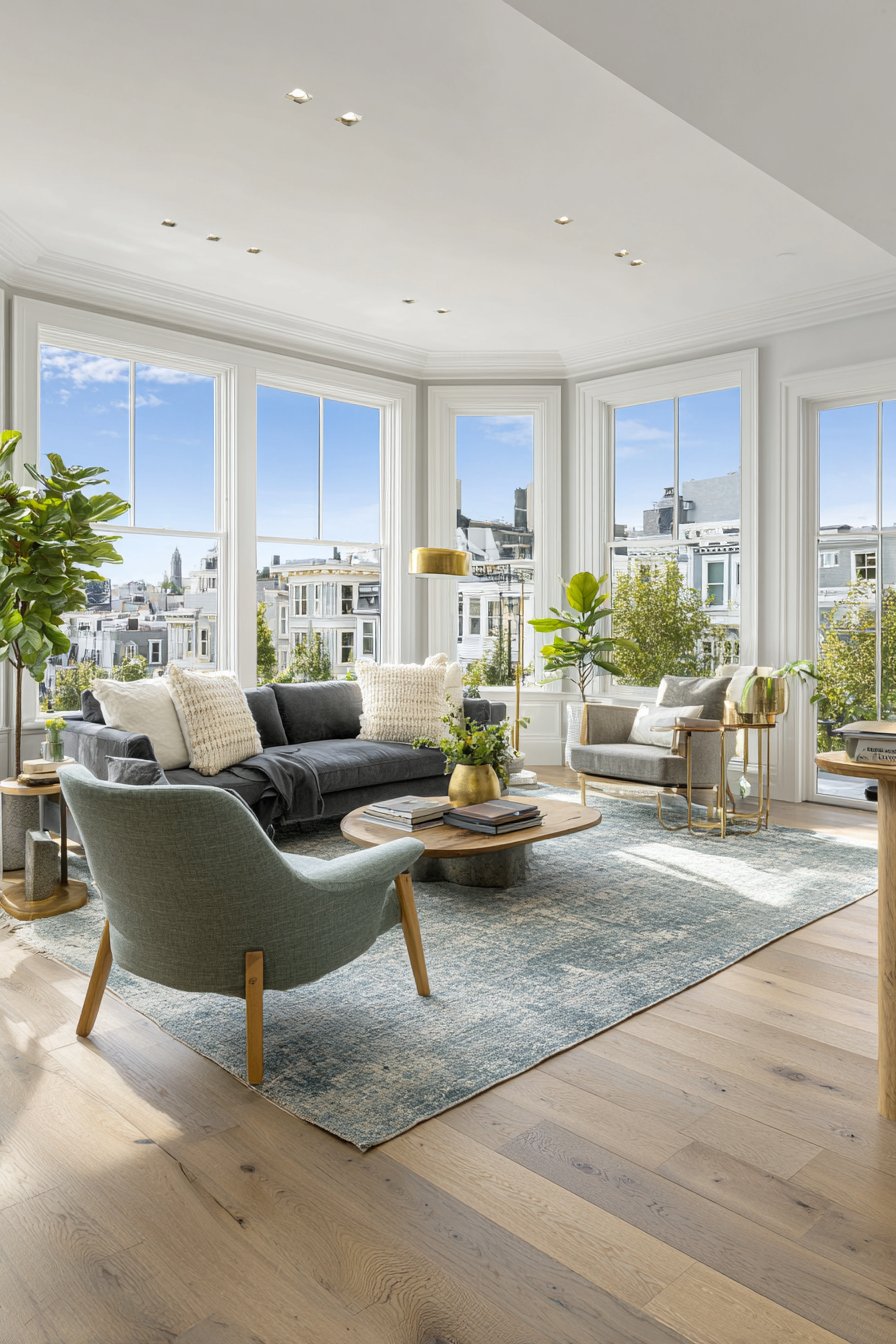 - Choose a light-colored area rug to ground the space without adding visual weight