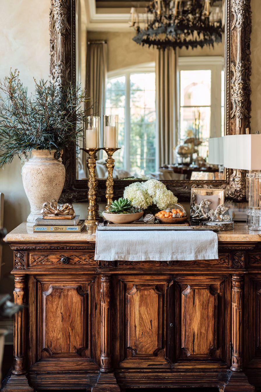 Consider adding a table runner or decorative mat as your base layer to protect the surface while adding color, texture, and visual interest. Choose materials that complement your buffet’s finish and your room’s overall aesthetic. This foundational layer anchors your arrangement while providing practical protection from scratches and moisture damage.