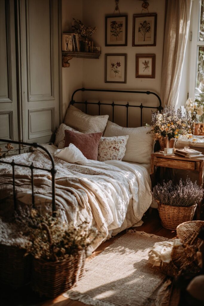 Dried flowers and plants bring the cottage garden directly into your bedroom sanctuary. Create arrangements of dried lavender, eucalyptus, and wheat in vintage vases or mason jars. These natural elements add organic beauty without requiring maintenance. Pressed flowers in antique frames make charming wall art that connects your space to nature’s delicate beauty.