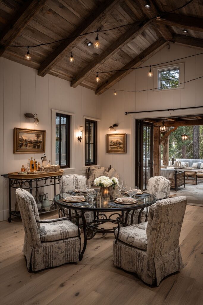 The magic truly happens overhead, where string lights cascade gracefully from exposed wooden beams, creating an enchanting canopy of warm light. This lighting choice transforms an ordinary dining experience into something special, evoking memories of outdoor gatherings and intimate celebrations. The interplay between the structured beams and the fluid lines of the string lights adds visual interest while maintaining the room’s cozy atmosphere.