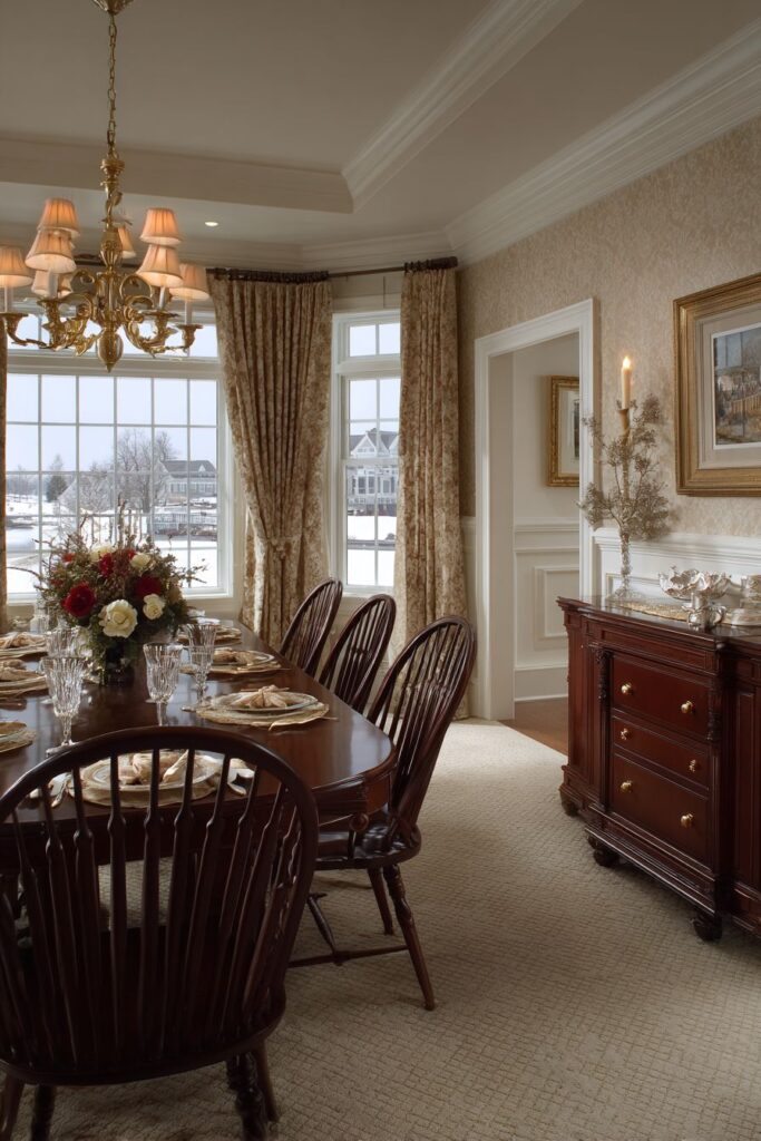 A traditional sideboard provides essential dining room storage while creating display opportunities for serving pieces and decorative objects. This furniture piece eliminates clutter while adding substantial architectural presence that balances the dining table’s visual weight. The sideboard’s surface provides staging area for serving meals while its storage compartments keep linens and serving pieces organized.