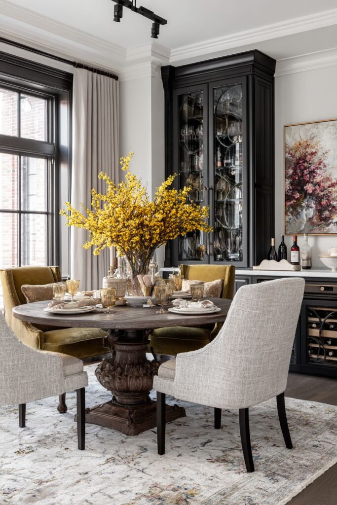 The balance between display storage and concealed storage creates a dining room that feels both sophisticated and practical, perfect for families who entertain regularly while maintaining busy daily schedules.