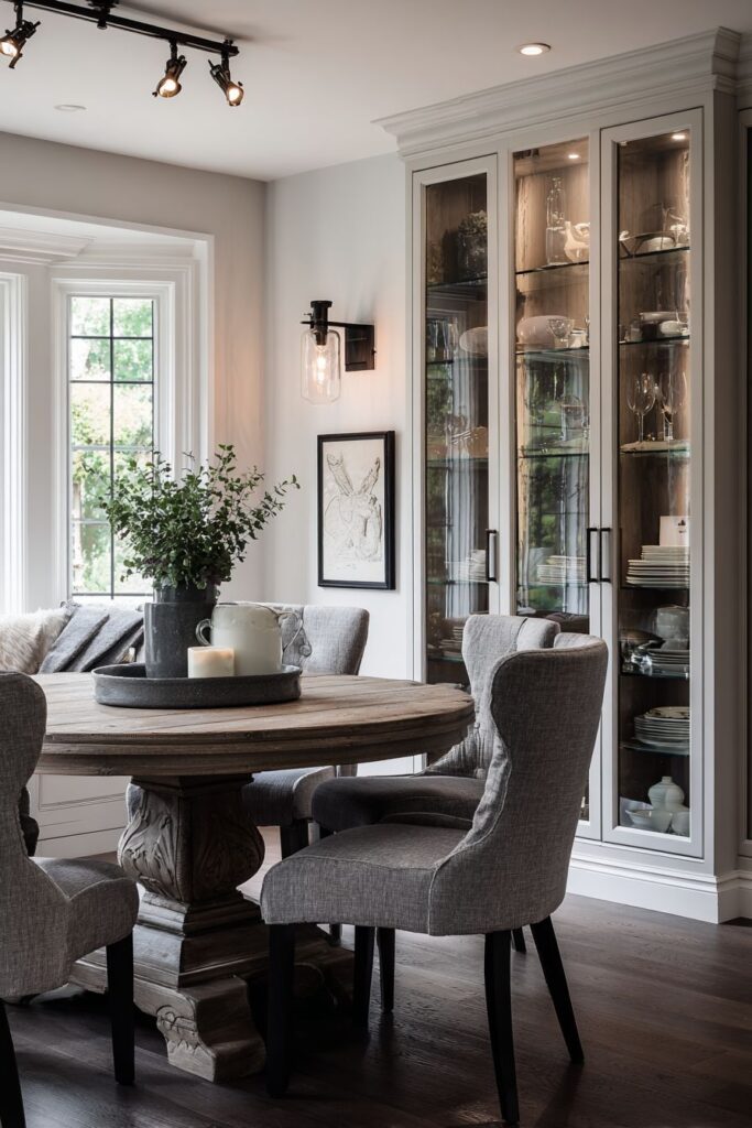 The storage solutions integrated throughout these designs prove that organization doesn’t require sacrificing style or warmth. From built-in banquettes with hidden storage to vintage hutches displaying beautiful collections, these approaches demonstrate how functional needs can become design assets. This integration of storage with style ensures that dining spaces remain uncluttered and serene while accommodating the practical needs of busy families.