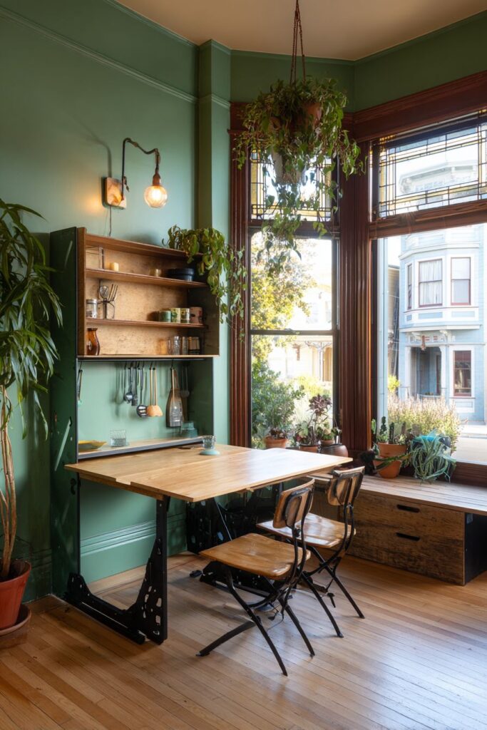 Floating shelves near the window serve dual purposes, displaying ceramic dishes as decorative elements while providing easy access to frequently used serving pieces. This approach eliminates the need for a separate china cabinet while keeping essentials within arm’s reach. Potted herbs on these same shelves bring life and fresh scents to the dining area while providing convenient access to fresh ingredients for cooking.