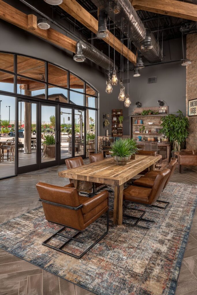 Metal chairs with worn leather seats provide comfortable seating while reinforcing the industrial aesthetic through honest materials and straightforward construction. The worn leather adds softness and warmth to balance the metal’s coolness while developing beautiful patina over time. This combination of materials creates seating that improves with age and use rather than showing wear as deterioration.