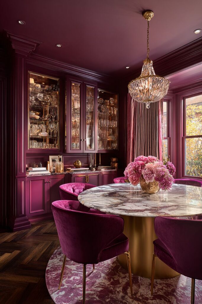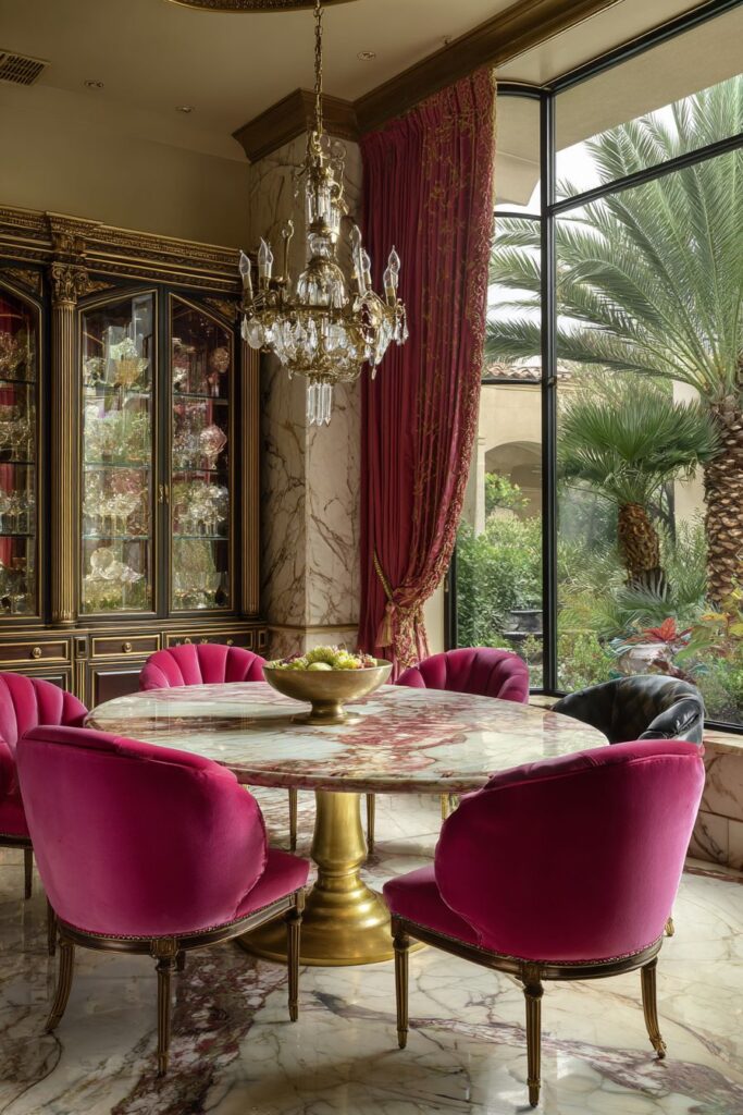 Velvet dining chairs in rich jewel tones create luxurious seating that invites touch and adds sophisticated color to the elegant setting. Jewel tones like emerald, sapphire, and ruby create richness without overwhelming the space while the velvet texture adds tactile luxury that enhances the overall dining experience. These rich colors complement the warm brass and neutral marble beautifully.
