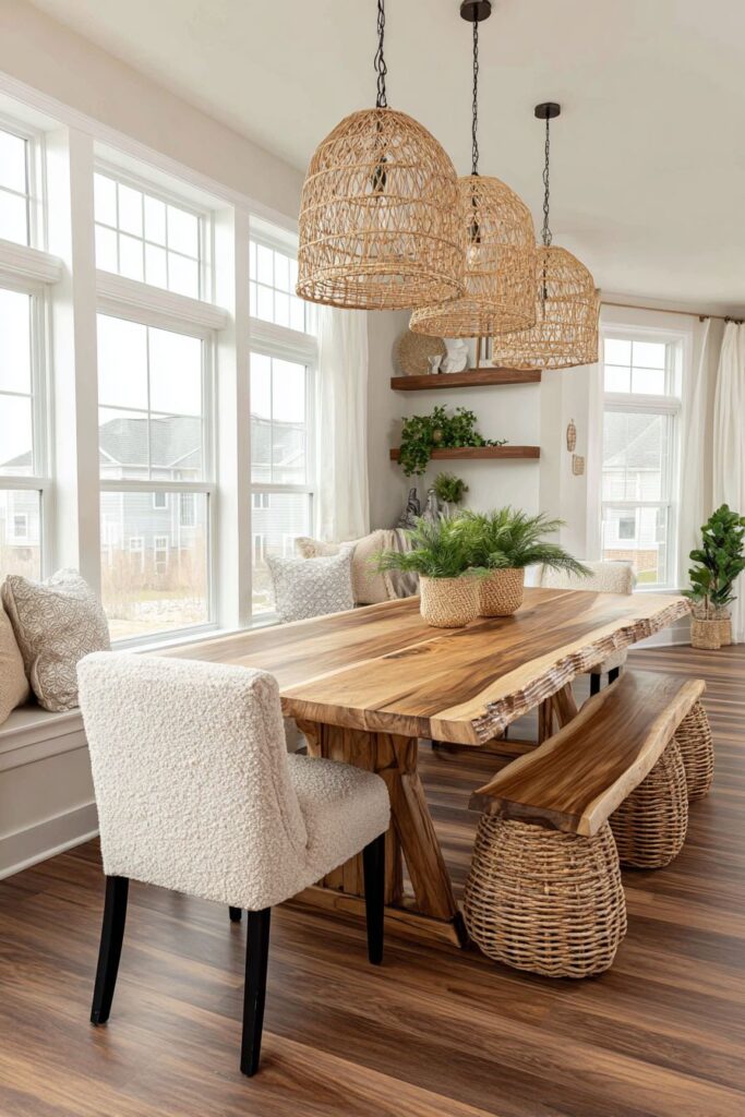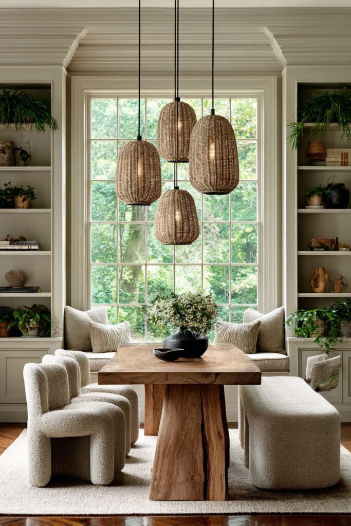 Woven pendant lights in natural materials hanging at varying heights create dynamic overhead interest while reinforcing the organic theme through authentic handcrafted construction. The irregular placement mirrors natural growth patterns while ensuring adequate light distribution across the dining surface. These natural fiber fixtures add textural warmth while providing focused task lighting that complements the live edge table’s organic character.