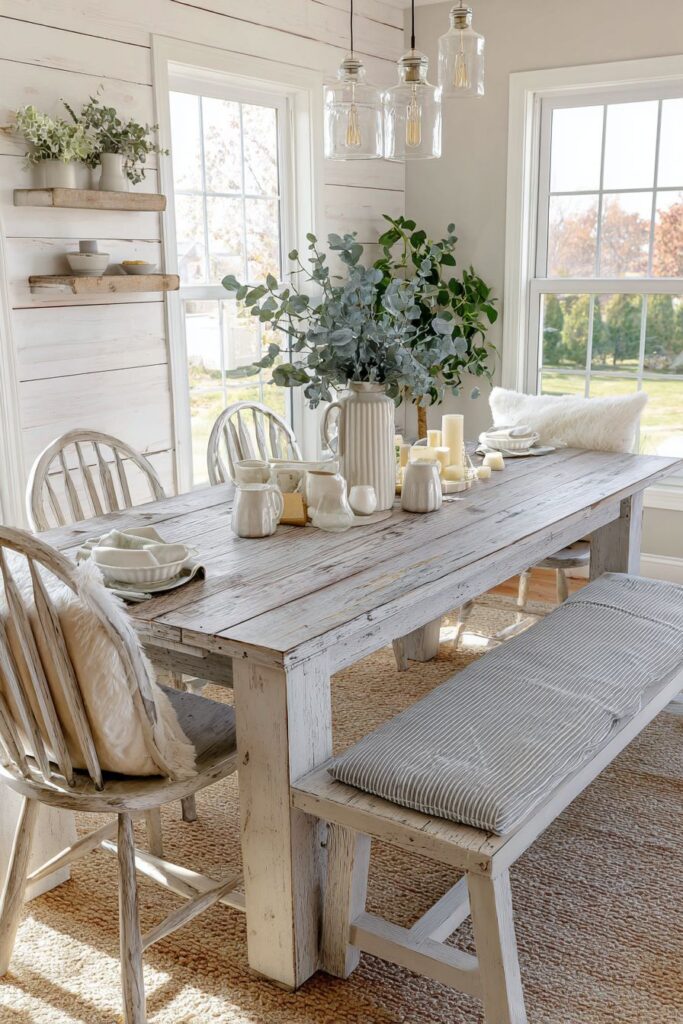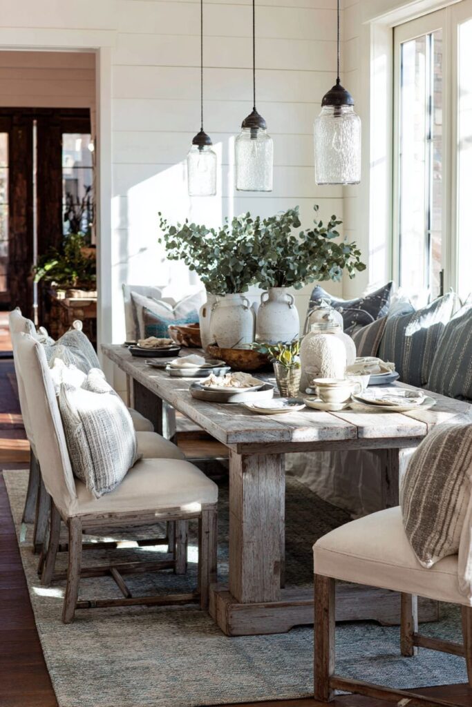 Mason jar pendant lights suspended at varying heights above the table provide both task lighting and rustic charm. The irregular placement mirrors the organic nature of farmhouse design, avoiding the formal symmetry of traditional dining rooms in favor of a more relaxed, collected-over-time appearance. Fresh eucalyptus in ceramic vases adds natural elements that complement the weathered wood while bringing life and fragrance to the space.
