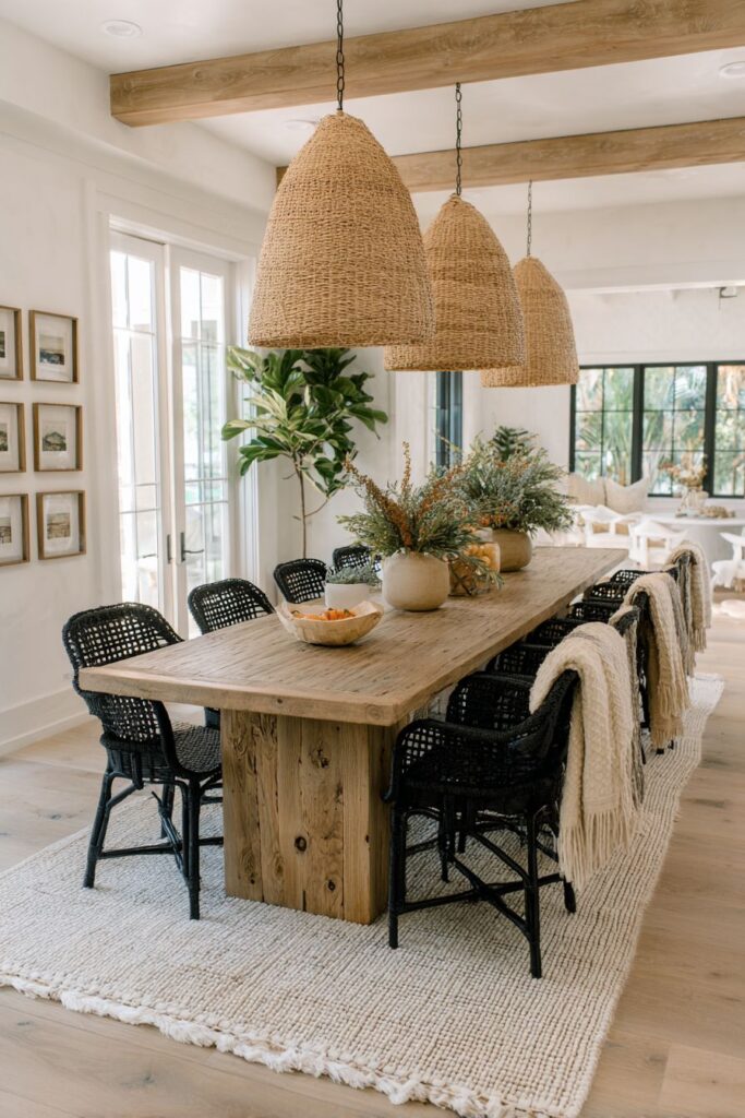 Woven pendant lights in natural fiber materials reinforce the organic theme while providing focused task lighting over the dining surface. The natural materials and handcrafted quality of these fixtures complement the reclaimed wood table while adding textural interest overhead. Their irregular weave patterns cast beautiful shadows that change throughout the day, adding another layer of visual complexity to the space.