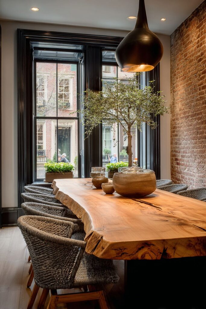 The exposed brick accent wall adds significant textural warmth while creating a backdrop that complements both the organic wood table and modern seating. The natural variations in brick color and texture provide visual interest without competing with the table’s live edge for attention. Potted plants positioned on window sills complete the natural theme while adding life and air-purifying benefits to the dining environment.