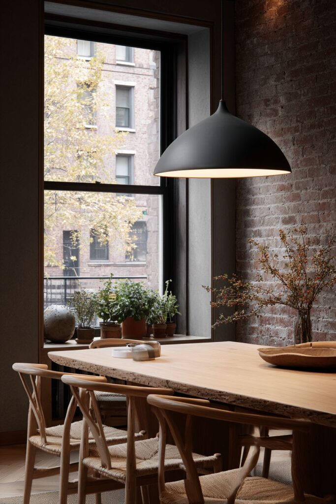 A statement pendant light in blackened steel provides focused task lighting while adding industrial elegance overhead. The dark metal finish creates a sophisticated contrast against the warm wood tones while maintaining the organic theme through its simple, unfussy design. This lighting choice ensures adequate illumination for dining while adding sculptural interest to the ceiling plane.