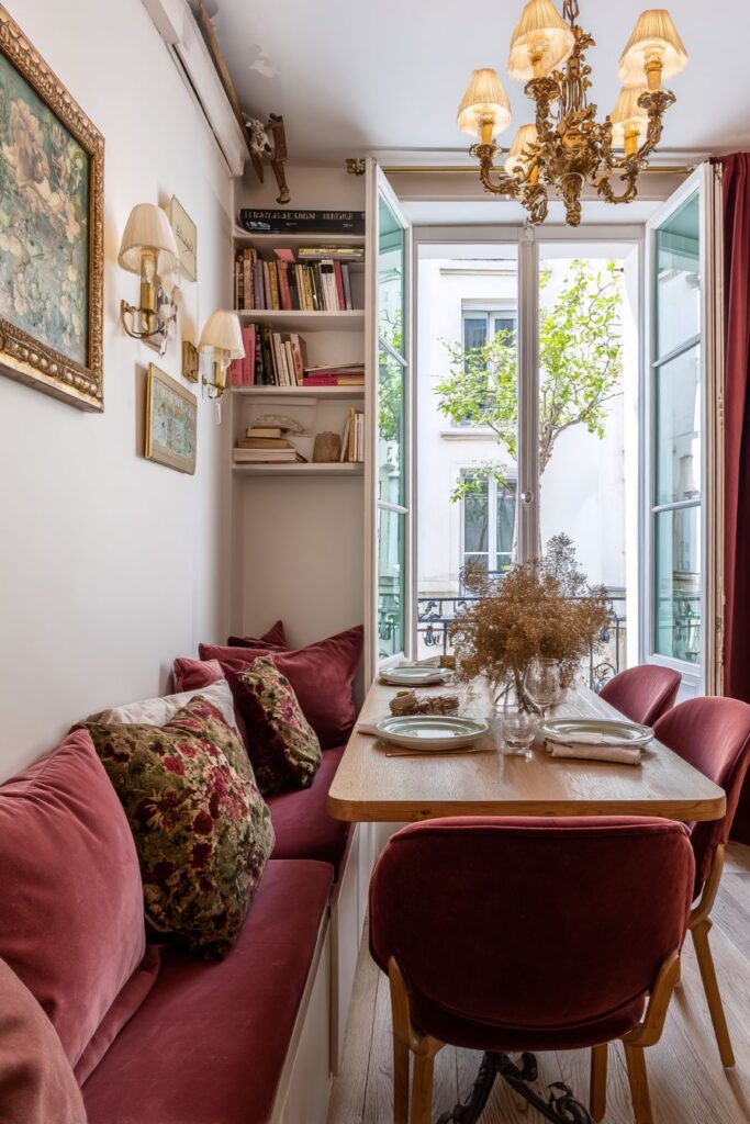 A small chandelier with fabric shades creates intimate overhead lighting that’s perfectly scaled for compact dining spaces. The fabric shades diffuse light beautifully while adding softness to the room’s overall aesthetic. This lighting choice provides adequate illumination without overwhelming the small space with too much fixture or too bright illumination.