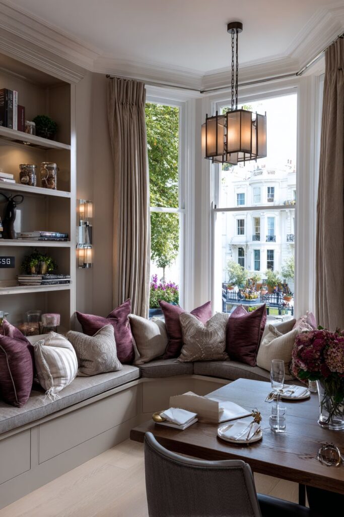 A window seat with storage underneath maximizes every available square inch while providing additional seating capacity for larger gatherings. The under-seat storage can accommodate table linens, seasonal items, or other dining accessories while the seating surface can accommodate extra diners when needed.