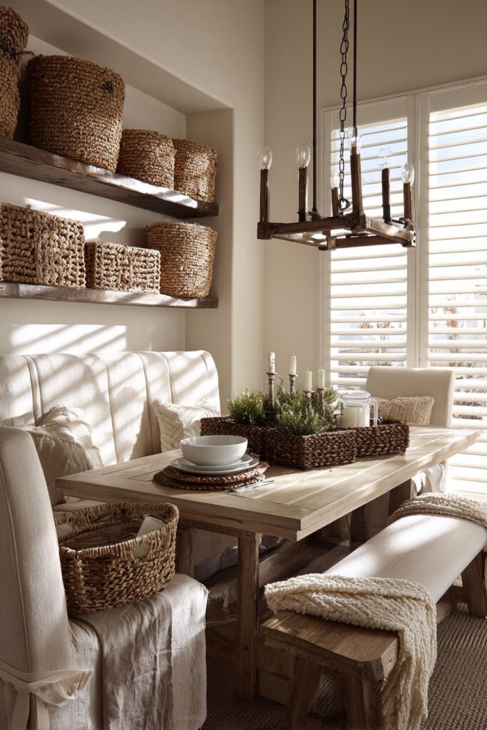 Woven baskets positioned on floating shelves provide both practical storage and decorative texture that reinforces the casual, organic theme. These natural storage solutions eliminate clutter while adding visual interest and textural warmth to vertical wall surfaces. The baskets can hold everything from table linens to children’s craft supplies, keeping the dining area organized and functional.