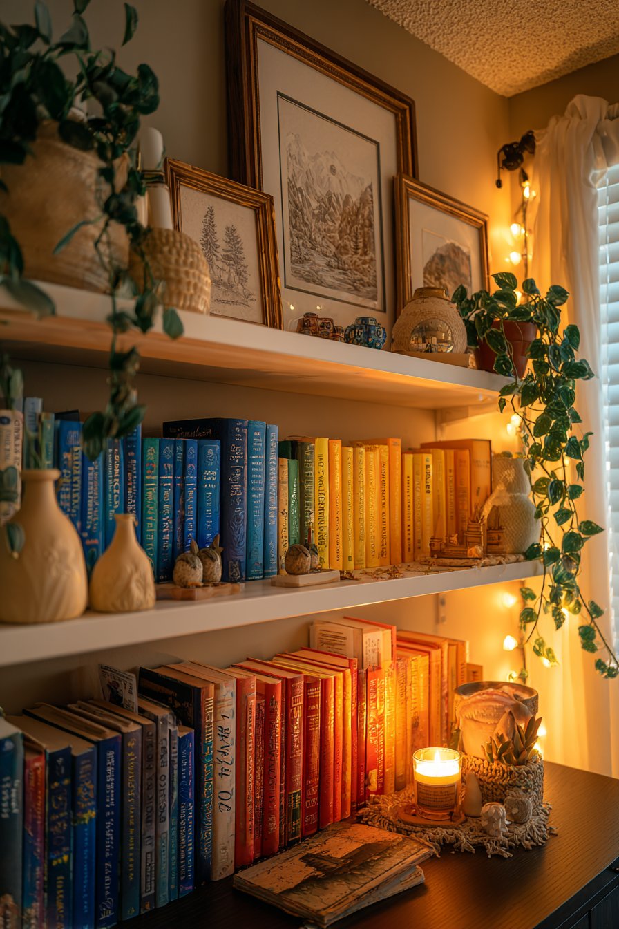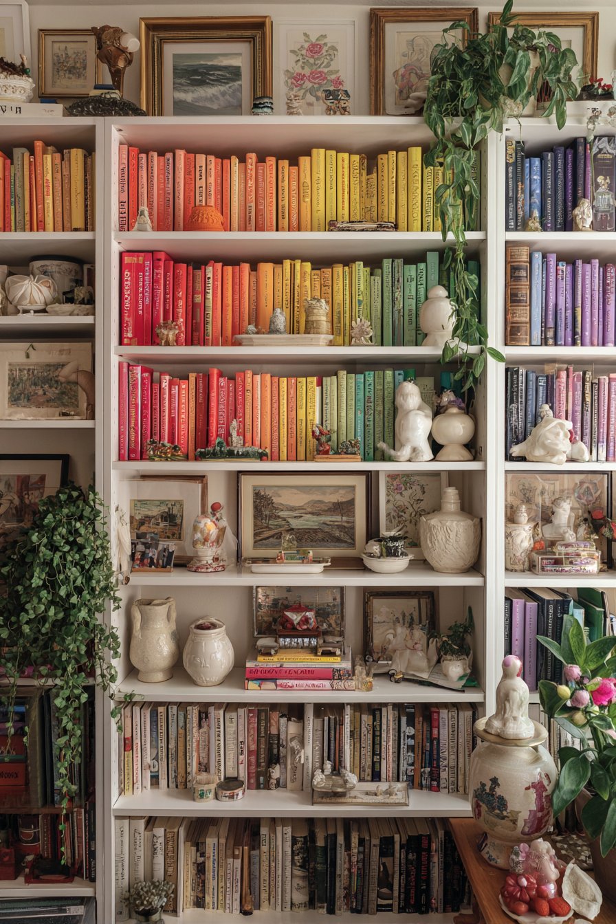 One of the most defining features of dopamine decor is the celebration of collections. Books, ceramics, vintage toys, travel souvenirs, art prints, plants — whatever brings you genuine joy belongs on display. This isn’t hoarding; it’s intentional curation of a personal narrative told through objects.