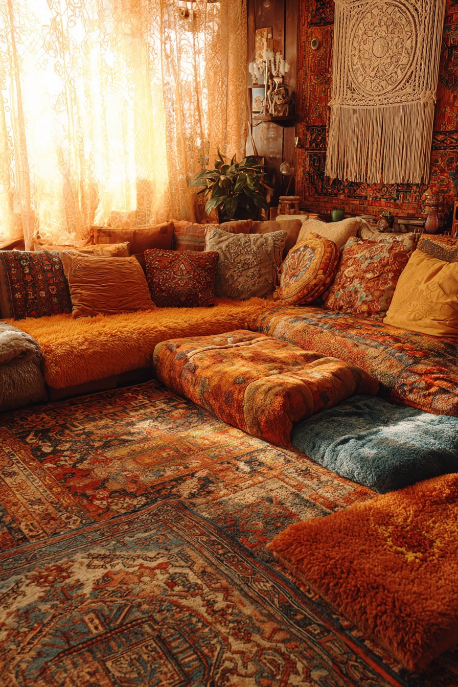 - Layer at least two area rugs in different textures for maximalist depth