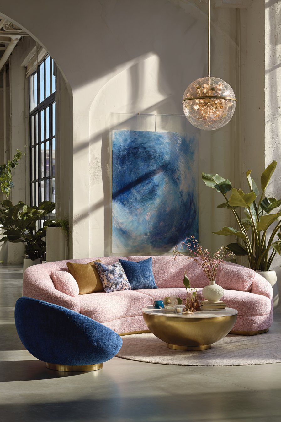 Curved furniture is especially beloved in this trend. Soft, rounded silhouettes — the bouclé sofa, the egg chair, the half-moon coffee table — feel inviting, warm, and inherently joyful. Their organic shapes contrast beautifully with the straight lines of architecture, creating a sense of softness and comfort that rigid, boxy furniture simply doesn’t deliver. Tactile richness through materials like velvet, bouclé, and boucle adds to the sensory delight.