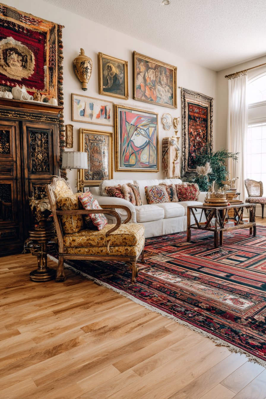 - Mix high and low pieces — expensive art alongside thrift store finds creates authenticity