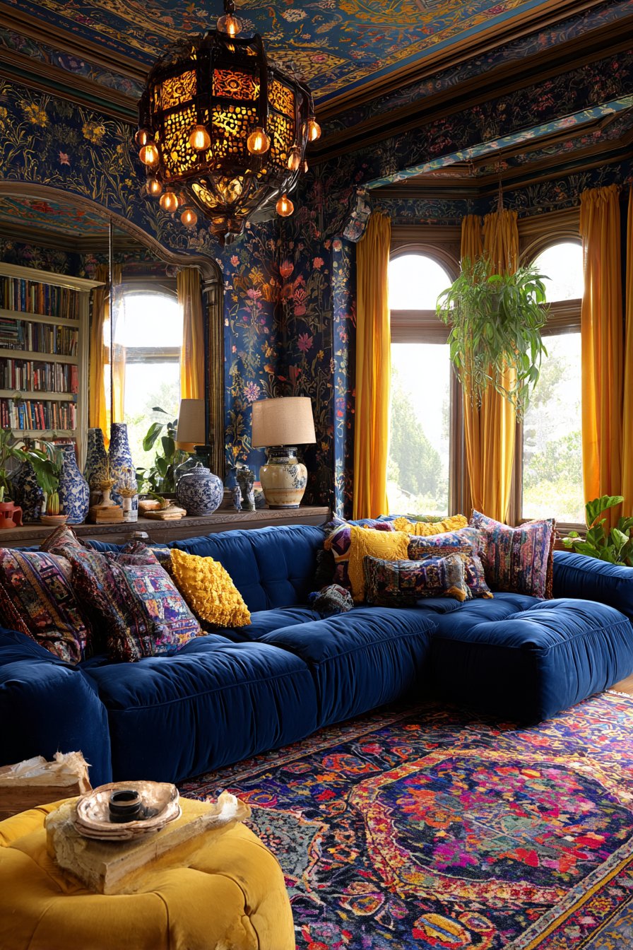 - Layer patterned textiles through cushions, curtains, and upholstery strategically