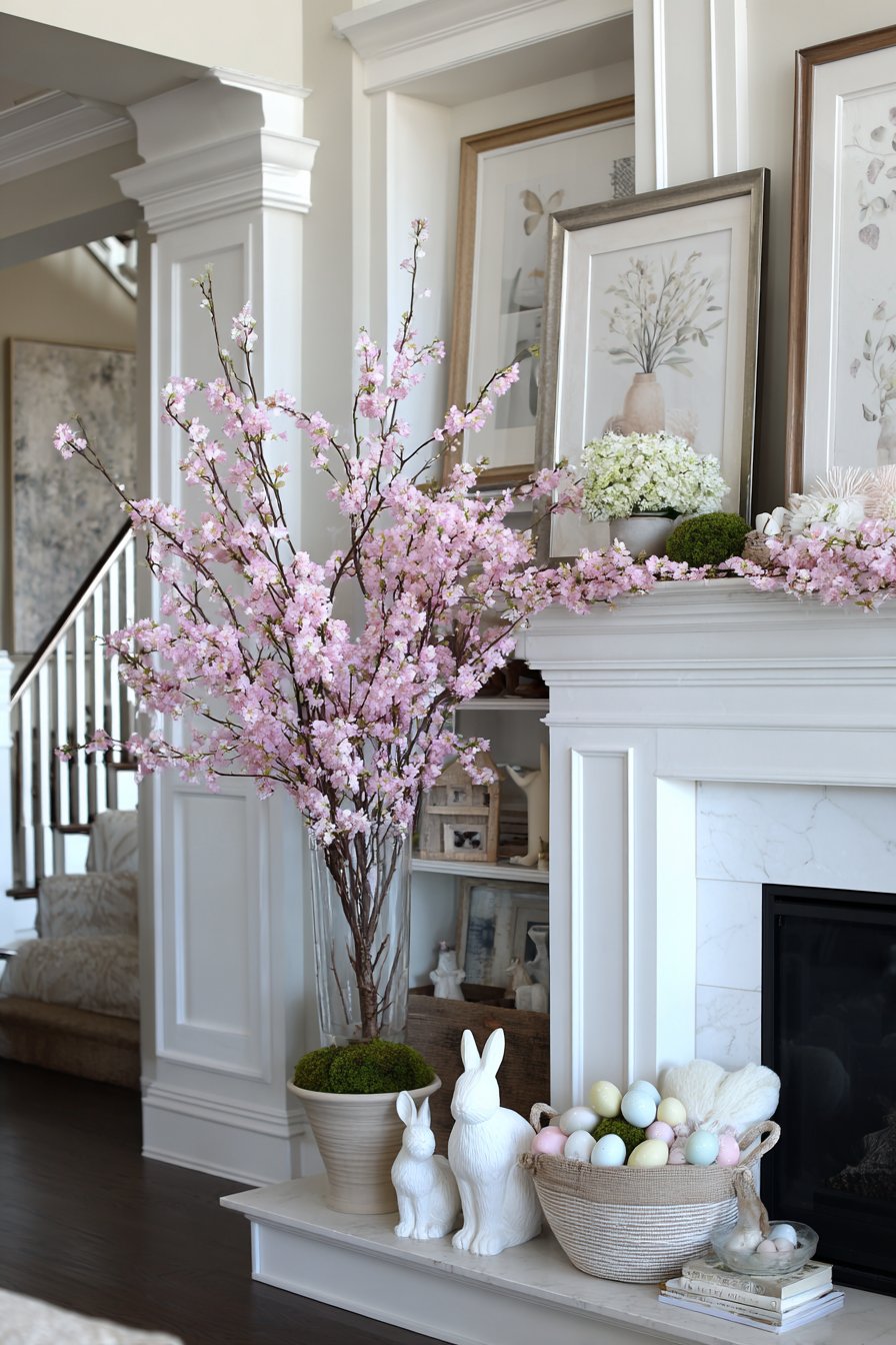 Layer your mantel using the classic design rule of three: group items in odd numbers and vary their heights, shapes, and textures. A tall glass vase filled with pussy willows or cherry blossom branches anchors one side, while a cluster of pastel eggs in a ceramic bowl anchors the other. A decorative garland of faux spring flowers draped along the mantel shelf ties everything together beautifully.