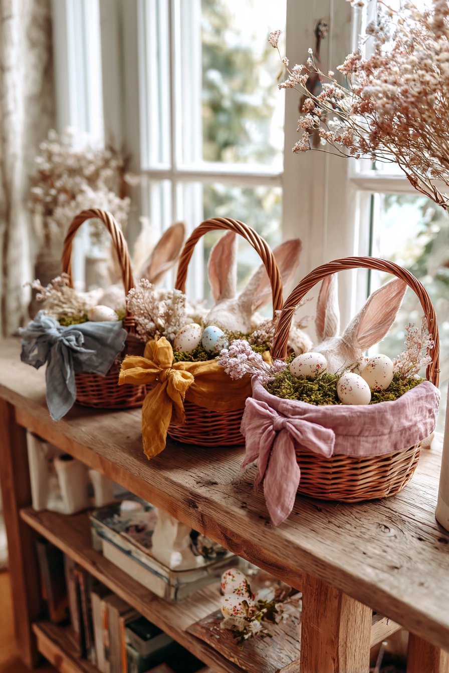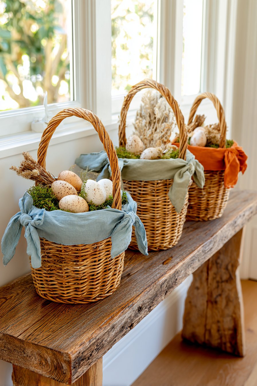 Choose baskets in natural materials like wicker, rattan, or seagrass for a timeless, organic look. Line them with soft linen fabric in pastel colors and fill them with a curated mix of faux eggs, moss, dried flowers, and small seasonal accents. Group several baskets together at different heights on a bookshelf, console table, or window seat for a charming vignette effect.