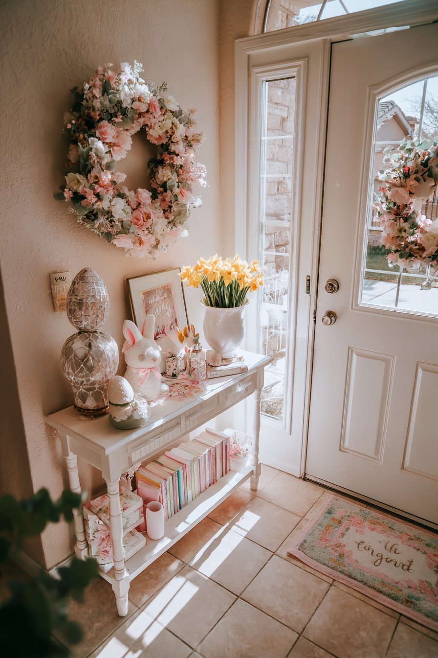 Inside the entryway, a console table styling moment awaits. Layer a spring-themed runner beneath a vase of tulips or daffodils. Add a decorative egg topiary or a ceramic bunny figurine beside a stack of seasonal books with pastel spines. A small framed print with a spring quote completes the vignette. Every element should feel intentional yet effortless, like spring itself.