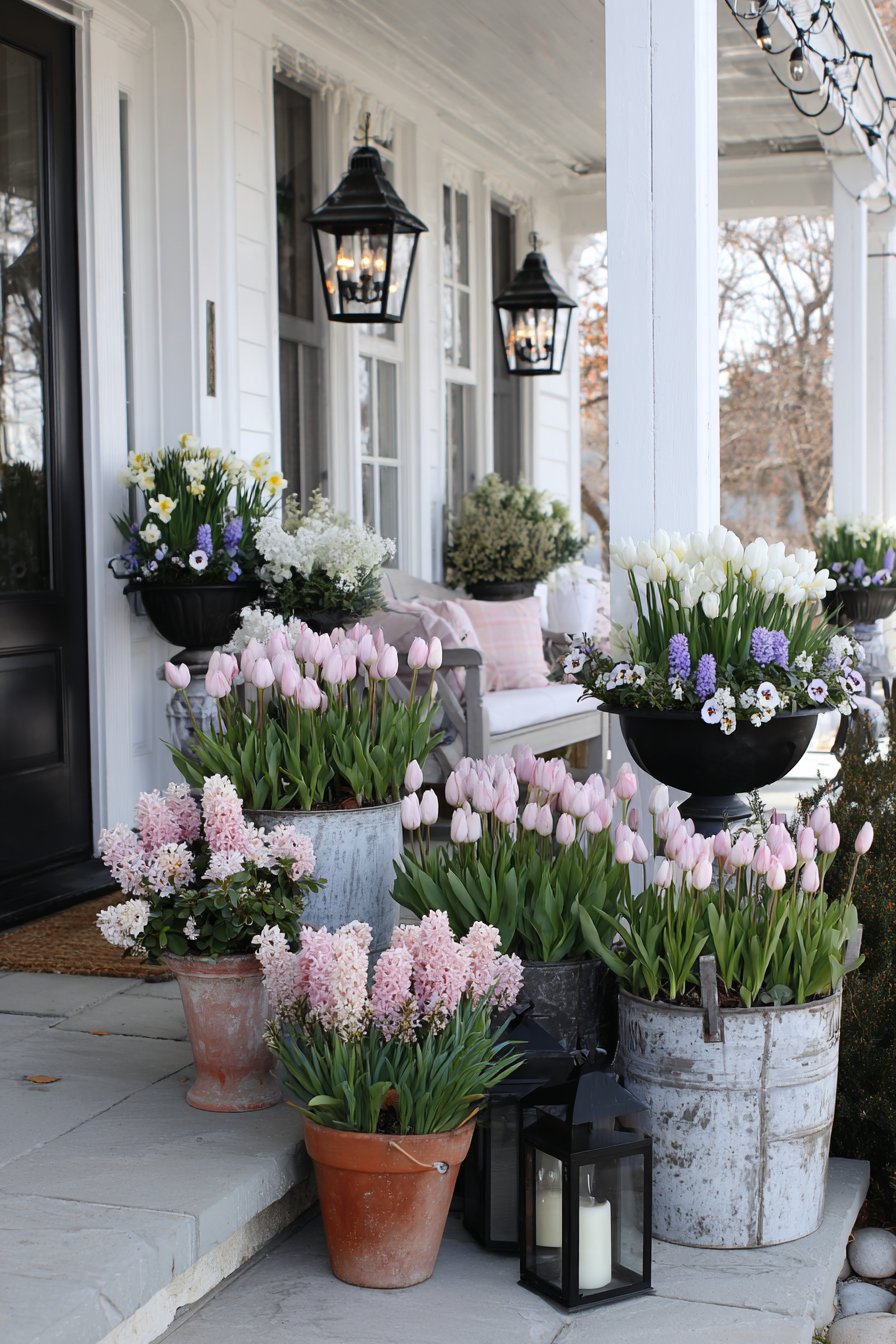 - Cluster potted tulips, hyacinths, and daffodils at the front entry