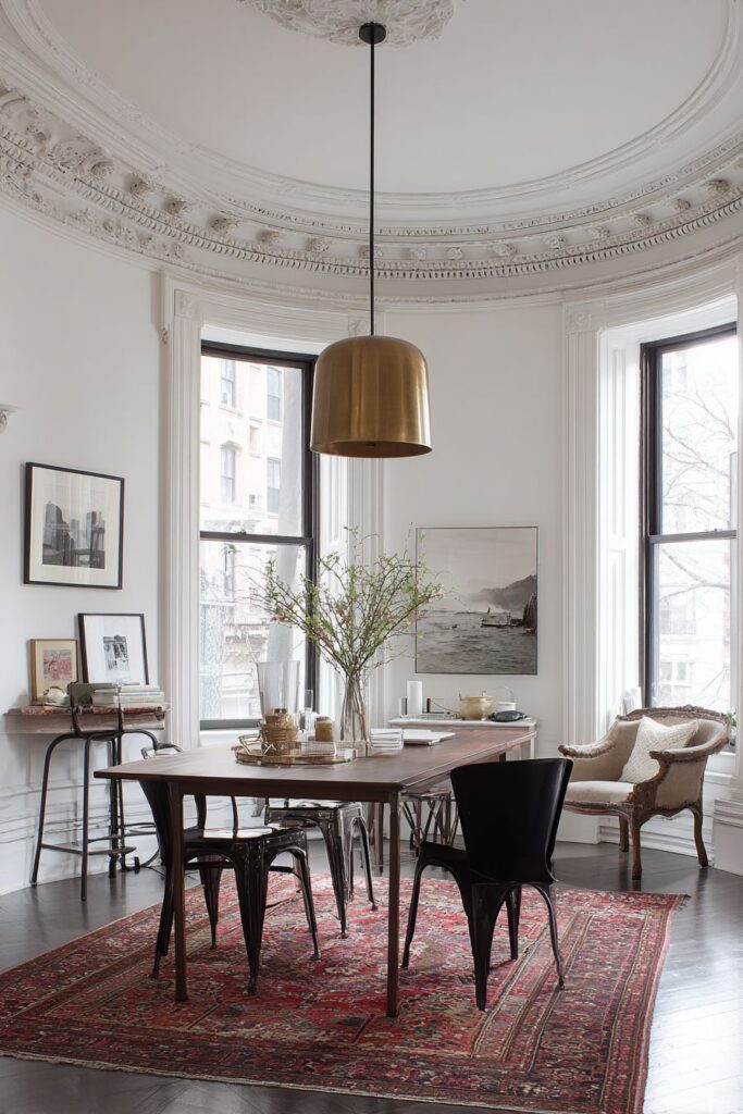 The lighting in this space demonstrates the power of unexpected pairings. A contemporary brass pendant light hangs gracefully above the table, its geometric form and warm metallic finish creating visual tension with the room’s traditional crown molding. This juxtaposition of old and new, ornate and minimal, creates a sophisticated dialogue between different design eras. The brass fixture not only provides functional task lighting but also serves as a sculptural element that bridges the gap between the antique furnishings and the modern table.