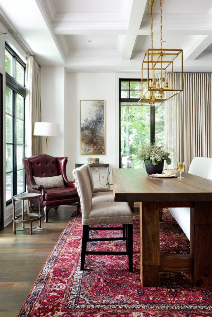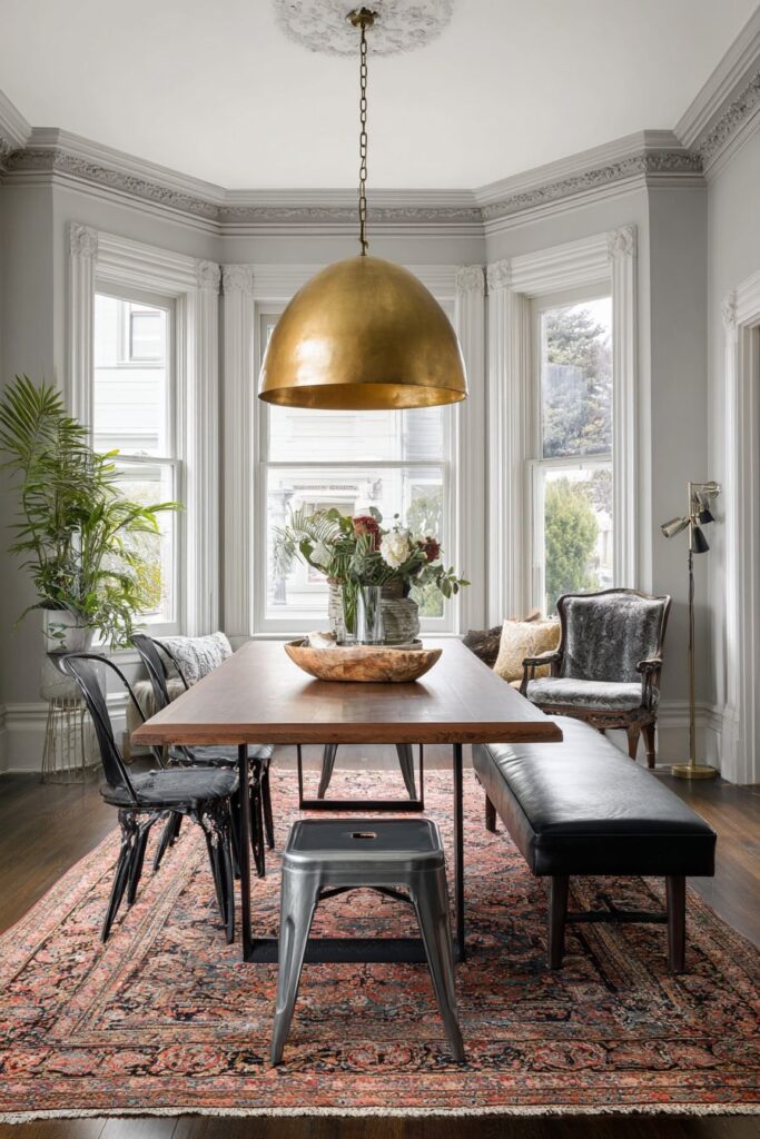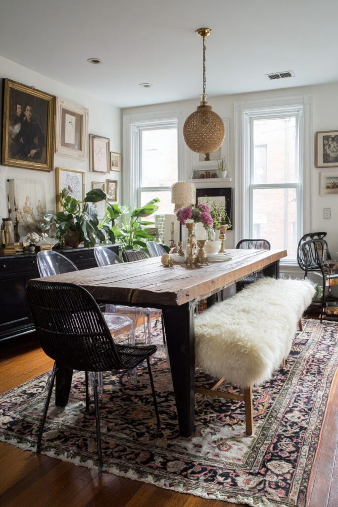 - Choose one large statement piece like a Persian rug to anchor your eclectic mix