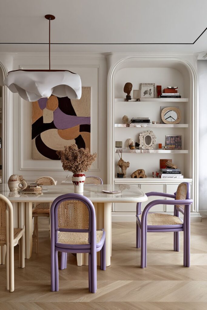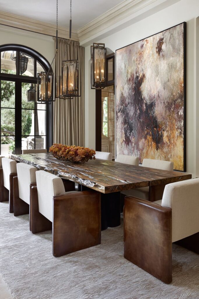 Art takes center stage in this creatively charged dining space, where an oversized abstract painting dominates one wall, creating a gallery-like atmosphere that elevates everyday dining to a cultural experience. The large scale of the artwork demands attention and provides a sophisticated focal point that demonstrates the homeowner’s commitment to supporting contemporary artists and living with meaningful art. This bold choice transforms the dining room from purely functional space to an extension of personal artistic taste.