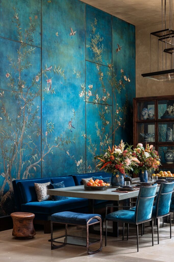 Hand-painted chinoiserie panels create an extraordinary backdrop that transforms this dining space into an exotic retreat reminiscent of 18th-century European fascination with Asian decorative arts. The intricate birds, flowering branches, and delicate landscapes provide visual richness that cannot be achieved through printed wallpapers or painted surfaces. This level of decorative detail requires careful balance in the furniture and accessories to prevent visual overwhelm while honoring the wallpaper’s artistic significance.